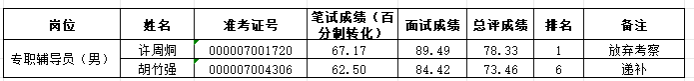 因专职辅导员(男)岗位考生许周烔自愿放弃入围考察资格,经研究,根据《浙江省省属事业单位2025年下半年集中公开招聘人员公告》和《浙江树人学院2025年下半年事业单位公开招聘资格复审、面试以及考察有关安排的通知》等有关规定,依据总评成绩从高分到低分依次递补原则,现将递补入围考察人员名单予以公布: