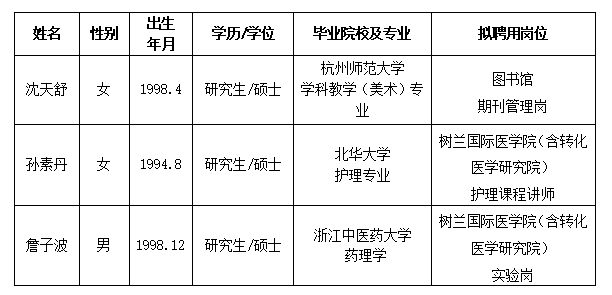 根据学校招聘计划,经过面试、体检、考察等环节,拟聘用沈天舒等3位同志为岗位年薪制人员。现将上述人员的基本情况面向社会予以公示。