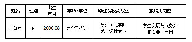 根据学校招聘计划,经过面试、体检、考察等环节,拟聘用金智贤同志为岗位年薪制人员。现将上述人员的基本情况面向社会予以公示。