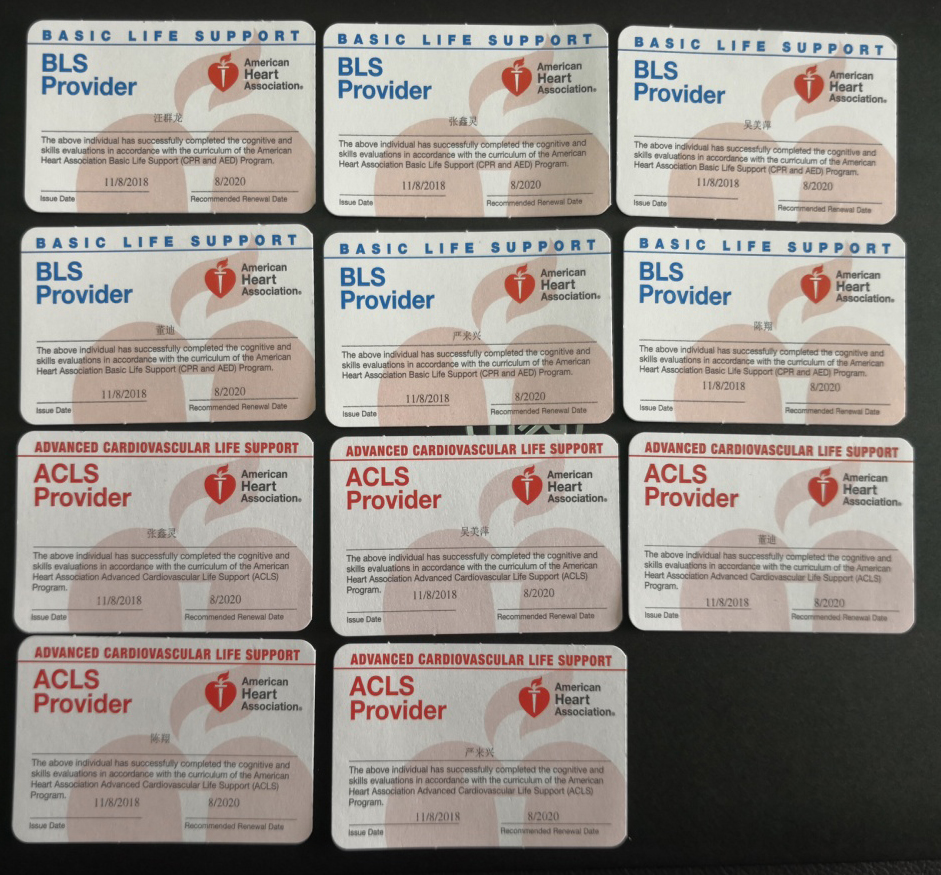 6位教师在课程培训中全程精神高度集中,综合利用高质量CRP技术、ACLS心律及药理学相关知识,通过涉入大量复杂的临床急救案例,灵活运用AHA标准急救操作技术,完成对成人、儿童、婴儿的心脏骤停、心动过缓、卒中、急性冠脉综合症、心肌梗死等案例的评估、急救的团队、单人操作考核,最终获得BLS和ACLS急救证书。行业学院教学团队经过此次标准化培训后,可向学院医、养、护、管四个专业及全校各学院的教师、学生推行first aid training(应急救护培训)、Heartsaver(心脏救护)、BLS(基础生命支持)与ACLS(高级心血管生命支持)培训以及CPR(心肺复苏)技术的普及。