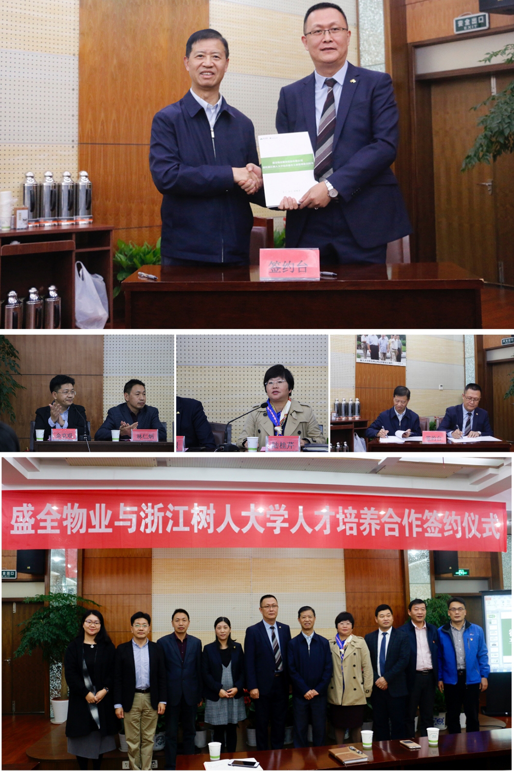 14日下午, “盛全物业与浙江树人大学人才培养合作”签约仪式隆重举行。盛全物业集团总经理吴光烈、副总经理郑明军、人力行政总监赵丽湘;浙江树人大学(浙江树人学院)校长徐绪卿、校纪委书记陆桂芹、教务处副处长及管理学院全体教师出席。盛全141班全体同学共同见证了这一神圣时刻。