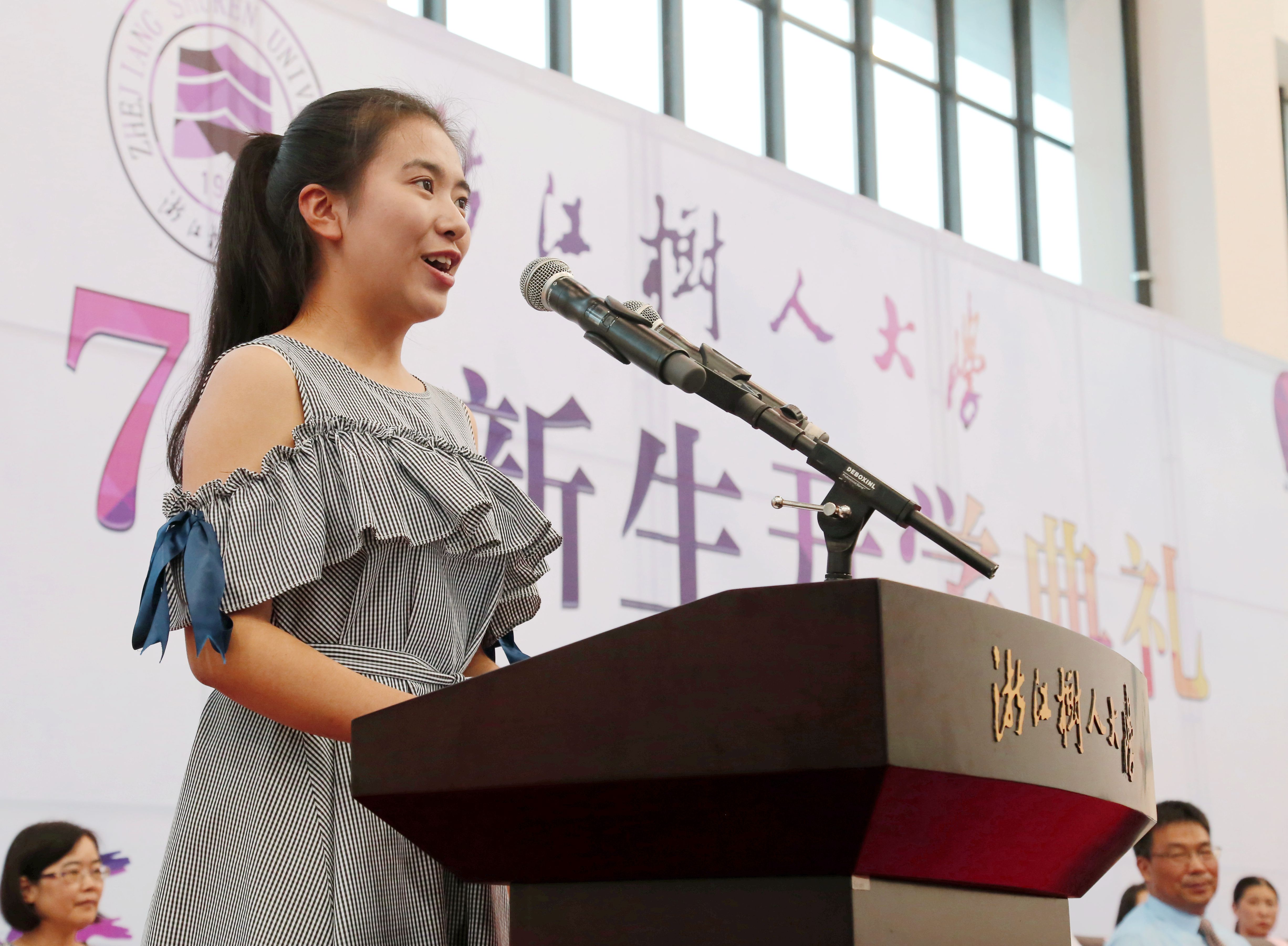 新生代表资源环科类174班的方雅恬以“我还年轻,但我没有时间”与同学们共勉,希望在接下去的大学时光中,与大家一起耐住寂寞,守住青春,鼓足勇气,去拼一拼,去闯一闯!