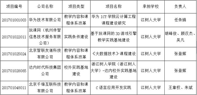 为贯彻落实《国务院办公厅关于深化高等学校创新创业教育改革的实施意见》(国办发〔2015〕36号)文件精神,创新产学合作协同育人机制,教育部高等教育司组织有关企业支持高校共同开展产学合作协同育人项目。根据《教育部高等教育司关于公布有关企业支持的产学合作协同育人项目申报指南(2017年第一批)的函》(教高司函〔2017〕13号)要求,浙江树人大学(浙江树人学院)信息科技学院积极组织教师撰写了项目申请报告,经评审,申报的以下五个项目获得立项: