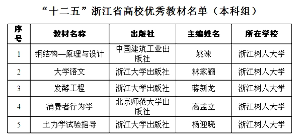 近日,根据《关于开展普通高校十二五优秀教材评选工作的通知》精神,经学校组织申报,浙江省高教学会教材建设专业委员会组织专家初审和终审,我校有五部教材成功入选“十二五”浙江省高校优秀教材名单。