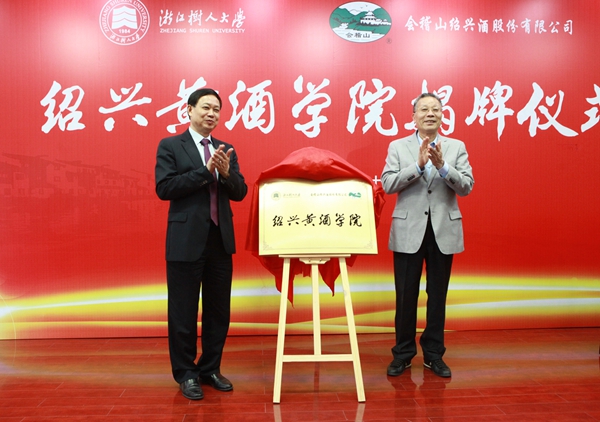 徐绪卿与金建顺分别代表学校与会稽山绍兴酒股份有限公司共同签署绍兴黄酒学院人才培养合作协议。陈加元、金良顺共同为“绍兴黄酒学院”揭牌。