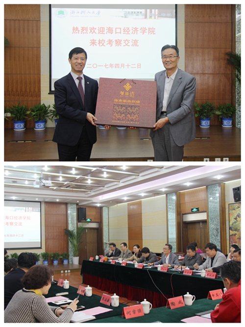 海口经济学院常务副院长王兴隆率队一行18人来我校考察。校长徐绪卿、副校长陈新民、叶时平等接待了王兴隆一行。徐绪卿全面介绍了学校情况。陈新民介绍了我校的科研建设情况,交流了我校学科建设的经验,详细阐述了学校科研建设的举措。叶时平从学校人才培养定位、人才培养模式改革问题、专业和课程应用型改革问题、师资队伍建设以及学校教学成果等五个方面进行介绍。王兴隆代表海口经济学院对我校的热情接待表示感谢,并赠送了礼品。