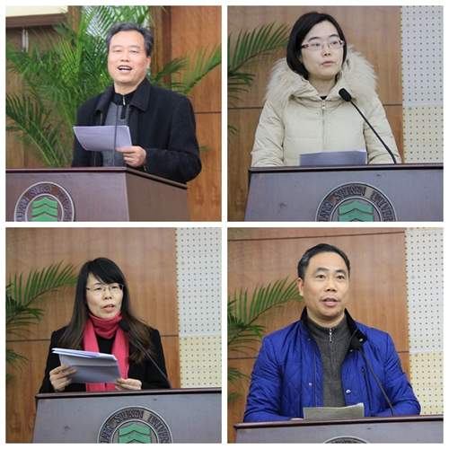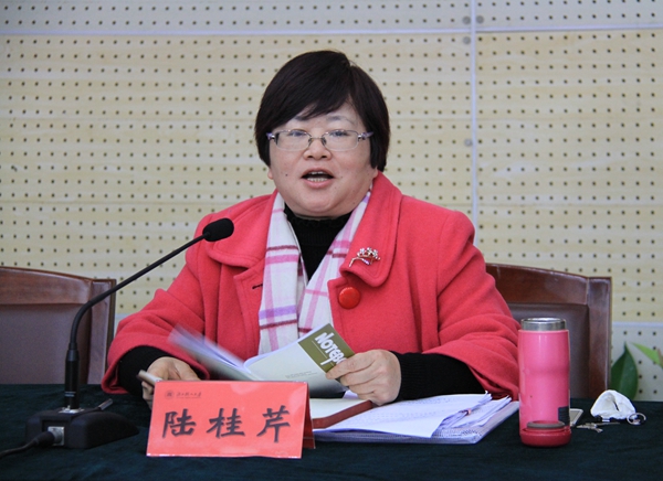 章清从六中全会具有特殊的历史方位、历史贡献、历史地位三个维度,全面阐释了全会的重要意义,从中国高等教育的根本地位、根本宗旨、根本任务、根本方向、根本标准、根本保证六个方面全方位阐明了落实全国高校思想政治工作会议精神对贯彻全会精神的重要作用。同时,他结合学校实际,用“五行、五难”形象地概括了学校干部队伍存在的主要问题,并用“境、德、情、勤、饮、断、担、规”八字重点,要求打造一支特别能战斗如铁一般的干部队伍。陆桂芹主要围绕全面从严治党的背景、十八大以来全面从严治党的措施及取得的新成就、十八届六中全会在全面从严治党上的新亮点及怎样学习贯彻十八届六中全会精神等内容,阐述了坚定不移地推进全面从严治党重要性、必要性及实施路径,同时针对我校干部队伍抛出四个问题予以共同思考与勉励。
