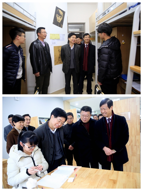 郑继伟一行考察了新校区教学楼、学术报告厅、图书馆、学生宿舍、综合楼等区域。在图书馆,郑继伟详细了解图书陈列与借阅等情况。在学生园区,郑继伟认真查看学生住宿环境,了解宿区基础设施配备与文化建设等情况,相关部门负责人向郑继伟汇报了学生管理宿区化这一新型管理模式。考察中,郑继伟与学生亲切交流,在详细询问学生衣食住行等情况后,他叮嘱学生要珍惜大学时光,牢牢把握学习机会好好学习,将来回报父母、回报社会。适逢期末之际,郑继伟祝愿学生能够考出理想成绩。