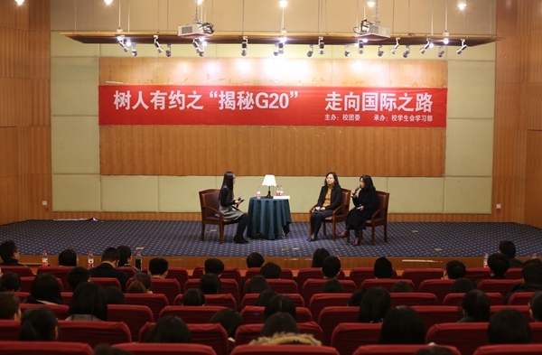 12月13日下午,由校团委主办,校学习部承办的树人有约之“揭秘G20”访谈活动在学术报告厅举行,G20韩国接待组副组长、国际交流与合作处副处长王云老师,外国语学院张静老师和树大小青荷代表刘嘉豪同学与大家一起分享了他们在G20期间的成长与收获。校团委书记曹斌老师以及各学院师生一同出席了本次树人有约。