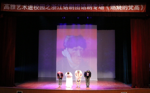 12月7日晚,树人礼堂上演了高雅艺术进校园之浙江话剧团话剧专场《燃烧的梵高》,话剧团的演员用高超精湛的演技,诠释了荷兰后印象派画家文森特·威廉·梵·高坎坷波澜的一生。当晚,校党委副书记王军与我校师生一同观看了本次话剧演出。