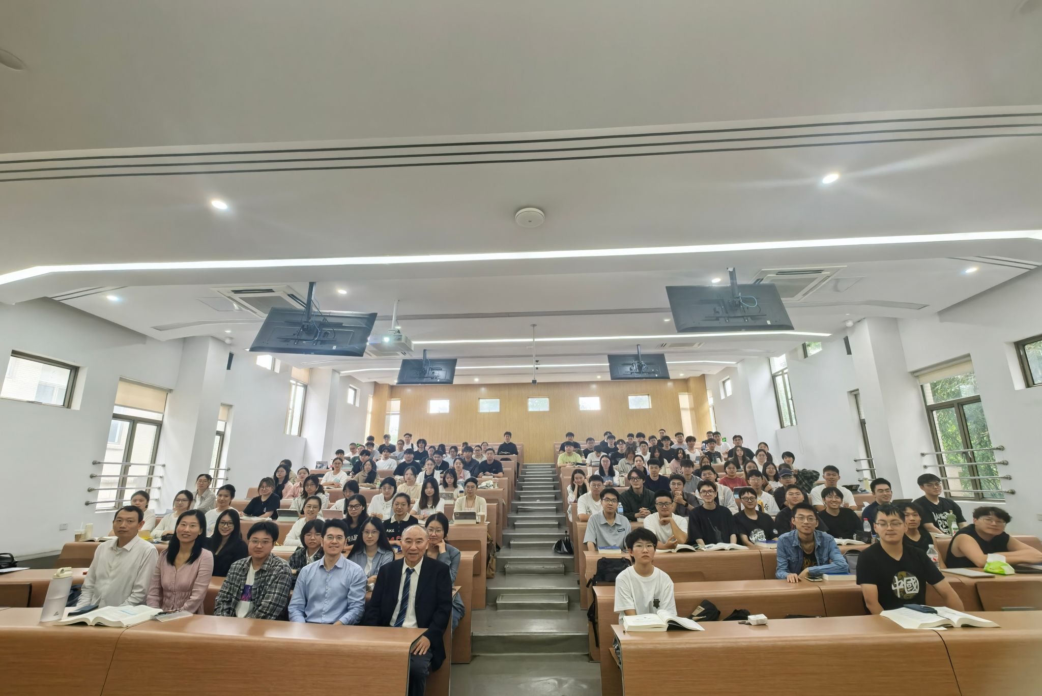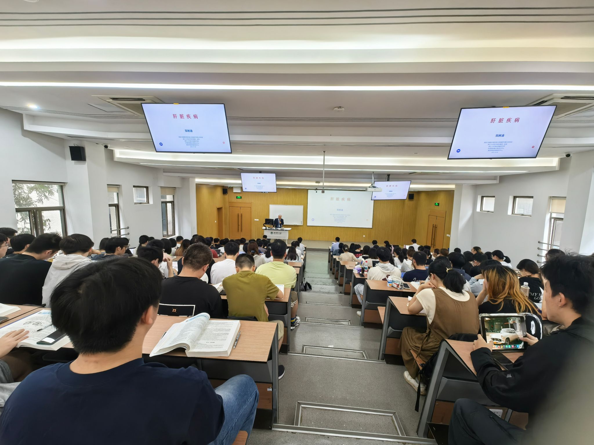 在课上,郑院士结合自己五十多年的从医经验,通过鲜活的临床案例,向学生们讲解了外科学的核心:不仅需要精湛的技术,更需要尊重生命、守护生命的责任感。郑院士详细介绍了肝脏解剖结构和当前肝脏外科学的发展,并结合实际患者的案例生动地讲述了各种肝脏疾病的知识,将枯燥的知识具象化。同学们在课堂上认真听讲,仔细记录。一位同学在课后表示:“郑院士让我认识到,真正的榜样应该是像他这样,在手术台上挽救生命、用专业和爱心服务人民的科学家。这让我明确了未来要努力的方向。”