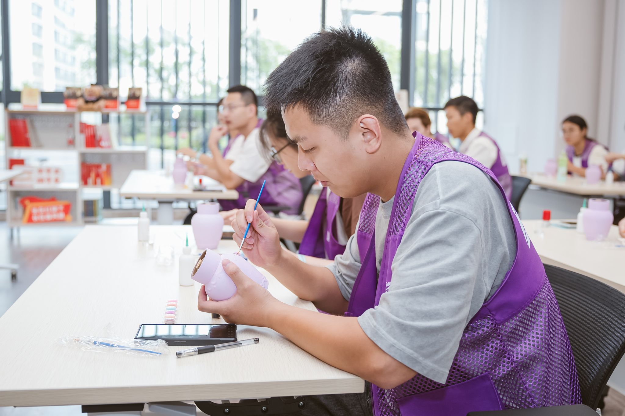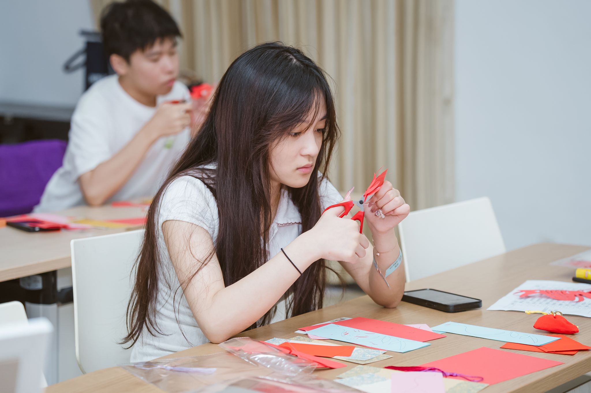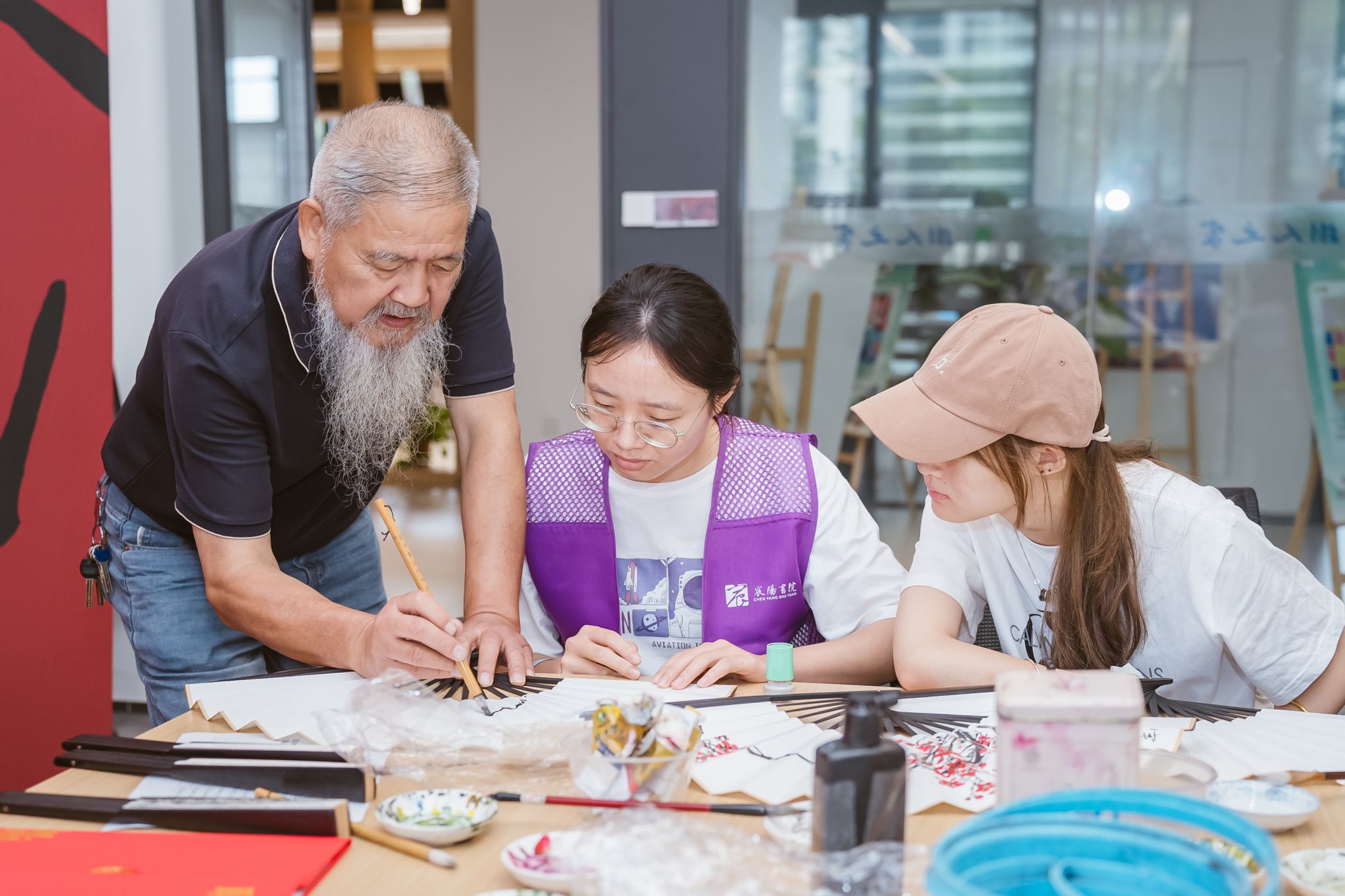 仪式结束后,志愿者培训环节随即展开,为后续非遗课程与游园体验活动做好充分准备。随着非遗课程与游园项目化体验活动陆续开展,学生们在扇艺、剪纸、花雕、箍桶、手作大糕等非遗项目中沉浸式体验越地传统文化的独特魅力,从“受教育者”逐步转变为“教育的参与者和传承者”。