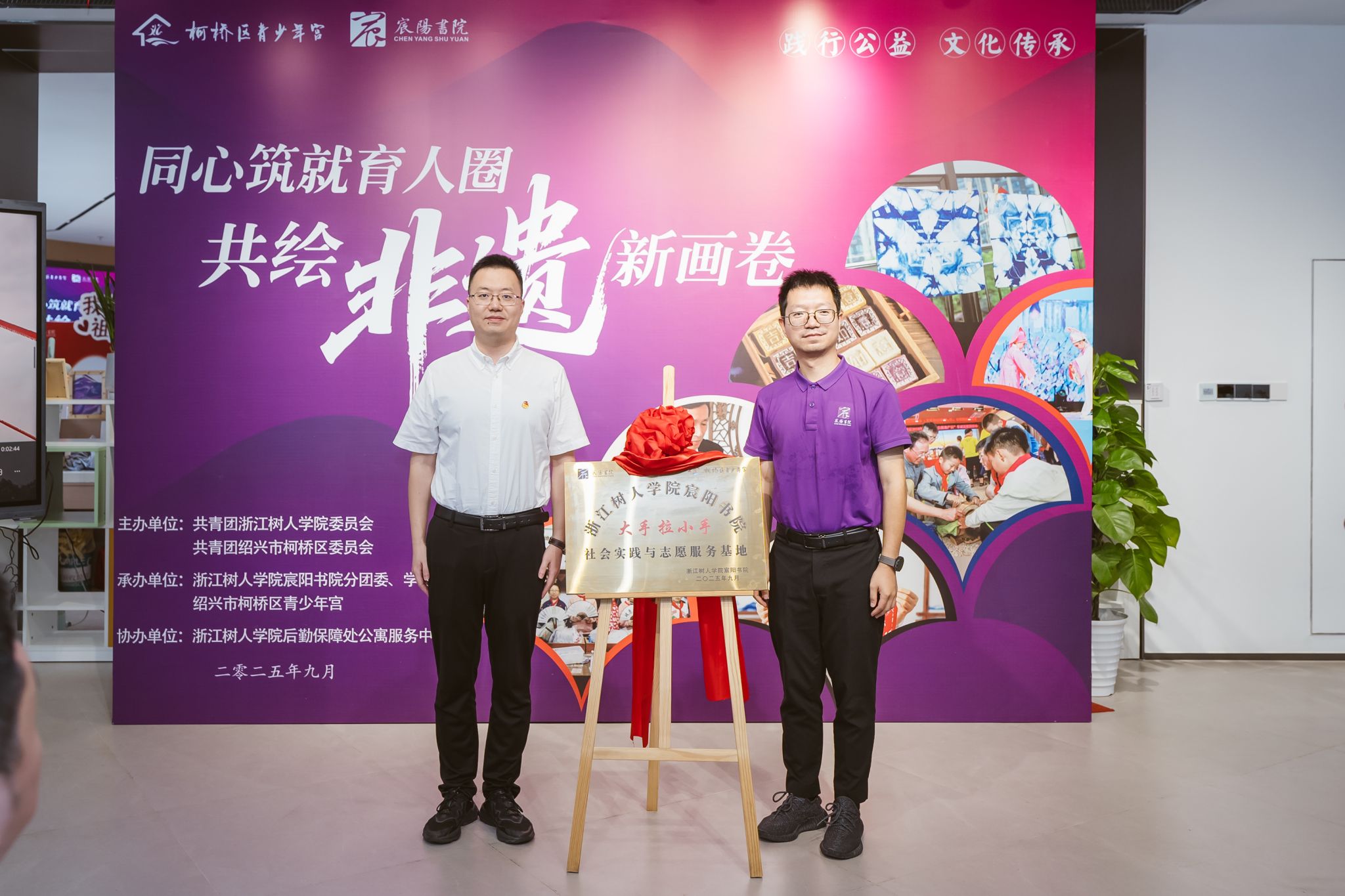 在热烈的掌声中,缪天赐与王伟君共同为“浙江树人学院宸阳书院非遗传承实践基地”揭牌。红布揭下的瞬间,标志着双方在非遗传承与青少年教育领域的合作迈入新阶段,共同肩负起培育时代新人的社会责任与使命。