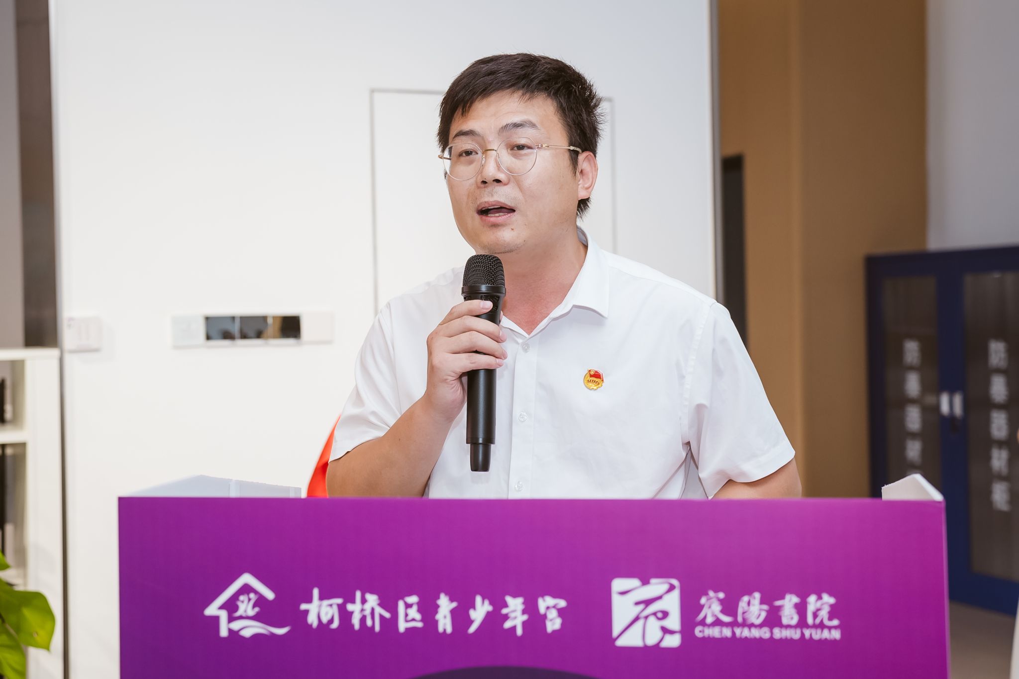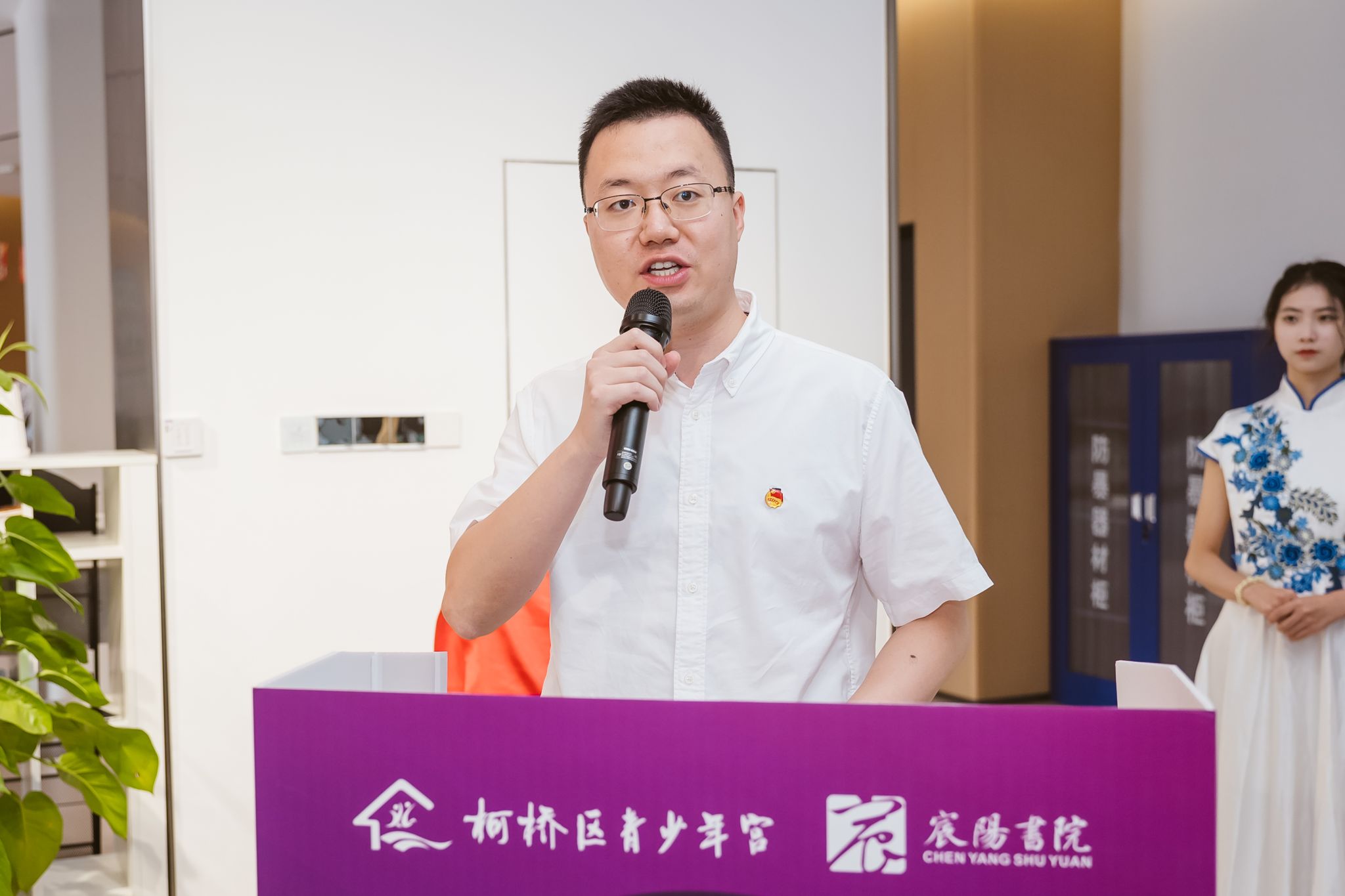 仪式在宸阳书院直属党支部书记王璀的主持下拉开帷幕。丁赞华首先致辞,他代表浙江树人学院团委对各位嘉宾的到来表示热烈欢迎,对柯桥区青少年宫长期以来对学校育人工作的支持表示衷心感谢。丁赞华指出,本次合作是在双方共建“青少年成长实践基地”基础上的进一步深化,是宸阳书院推动大中小学资源共享、优势互补、协同育人的关键举措。他强调,非遗是民族文化的精华与智慧结晶,推动非遗融入国民教育体系,对增强文化自信、促进青少年全面发展具有重要意义。