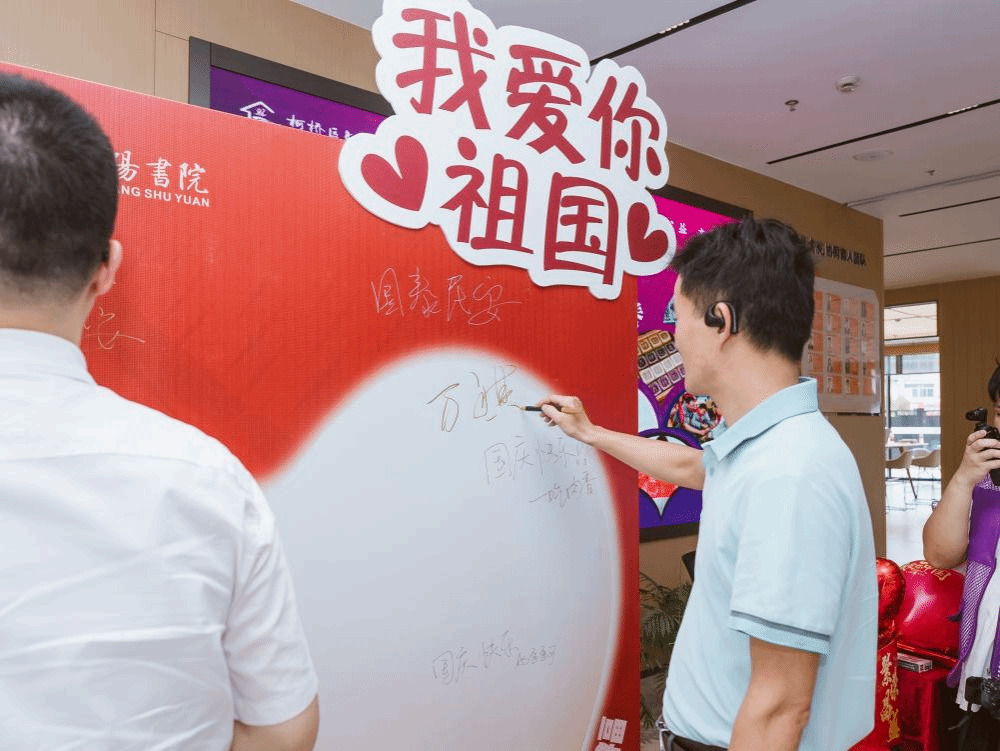 仪式尾声,与会领导移步主题喷绘前,执笔书写对祖国的美好祝福,以特别方式迎接国庆佳节的到来,表达对新时代教育事业的坚定信念与美好愿景。