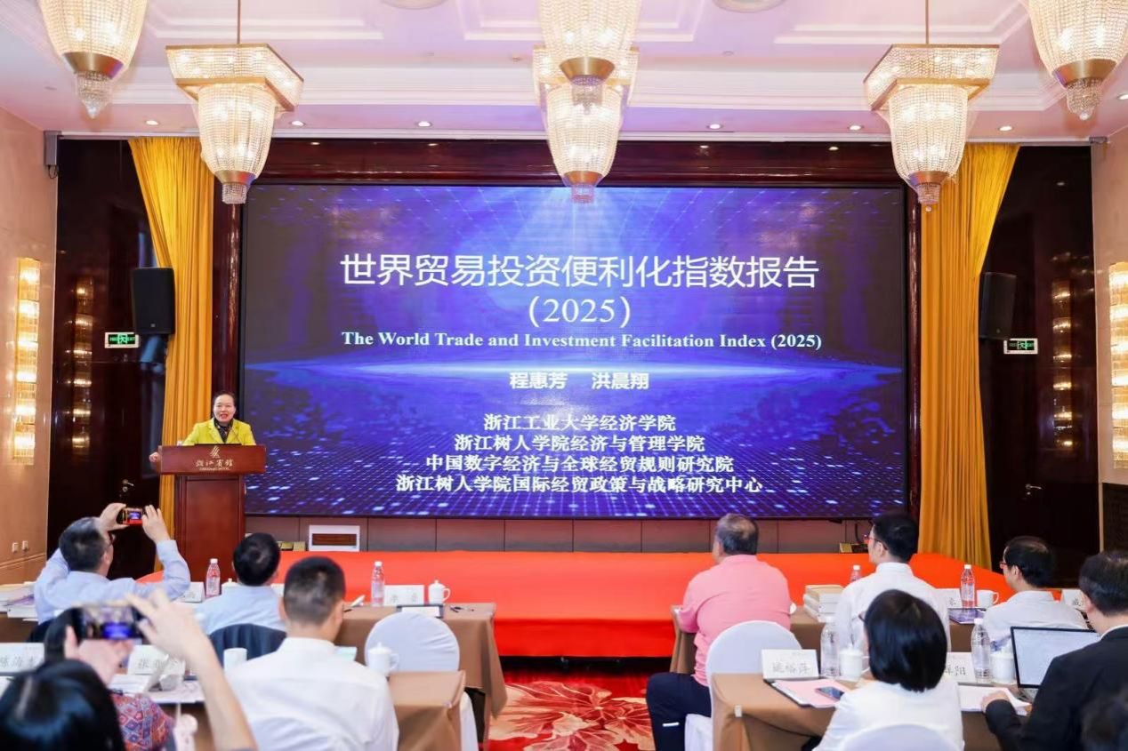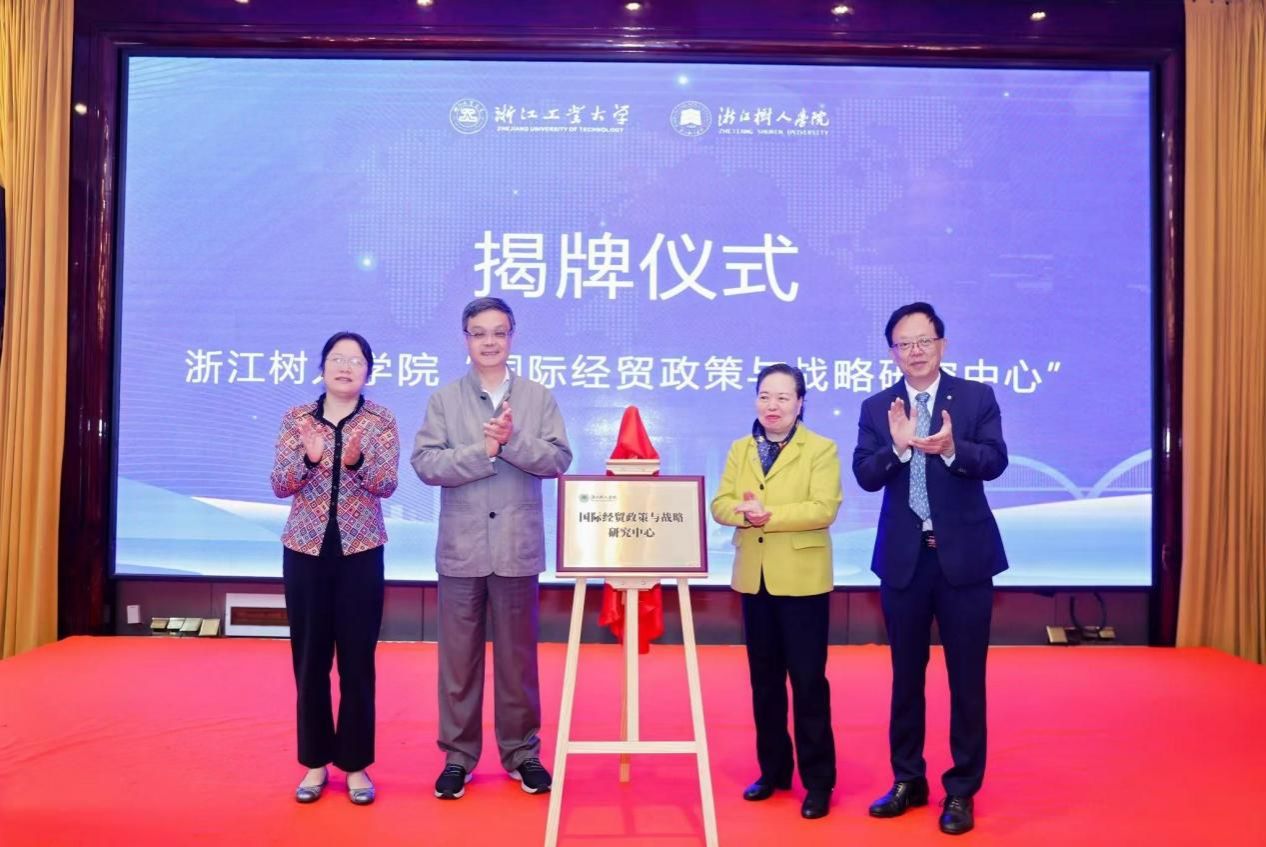 开幕式后,李鲁校长与我校经济与管理学院学术委员会主任程惠芳教授、院长阎洪、党委书记张亚珍共同为“国际经贸政策与战略研究中心”揭牌。该中心作为学校重点研究平台,由程惠芳教授担任首席专家,将聚焦高水平开放与高质量发展的机制研究,为我国推进制度型开放、建设现代化产业体系、塑造国际竞争新优势提供理论支撑与政策参考。揭牌仪式后,程惠芳教授发布了中心重要成果《世界贸易投资便利化指数报告》。