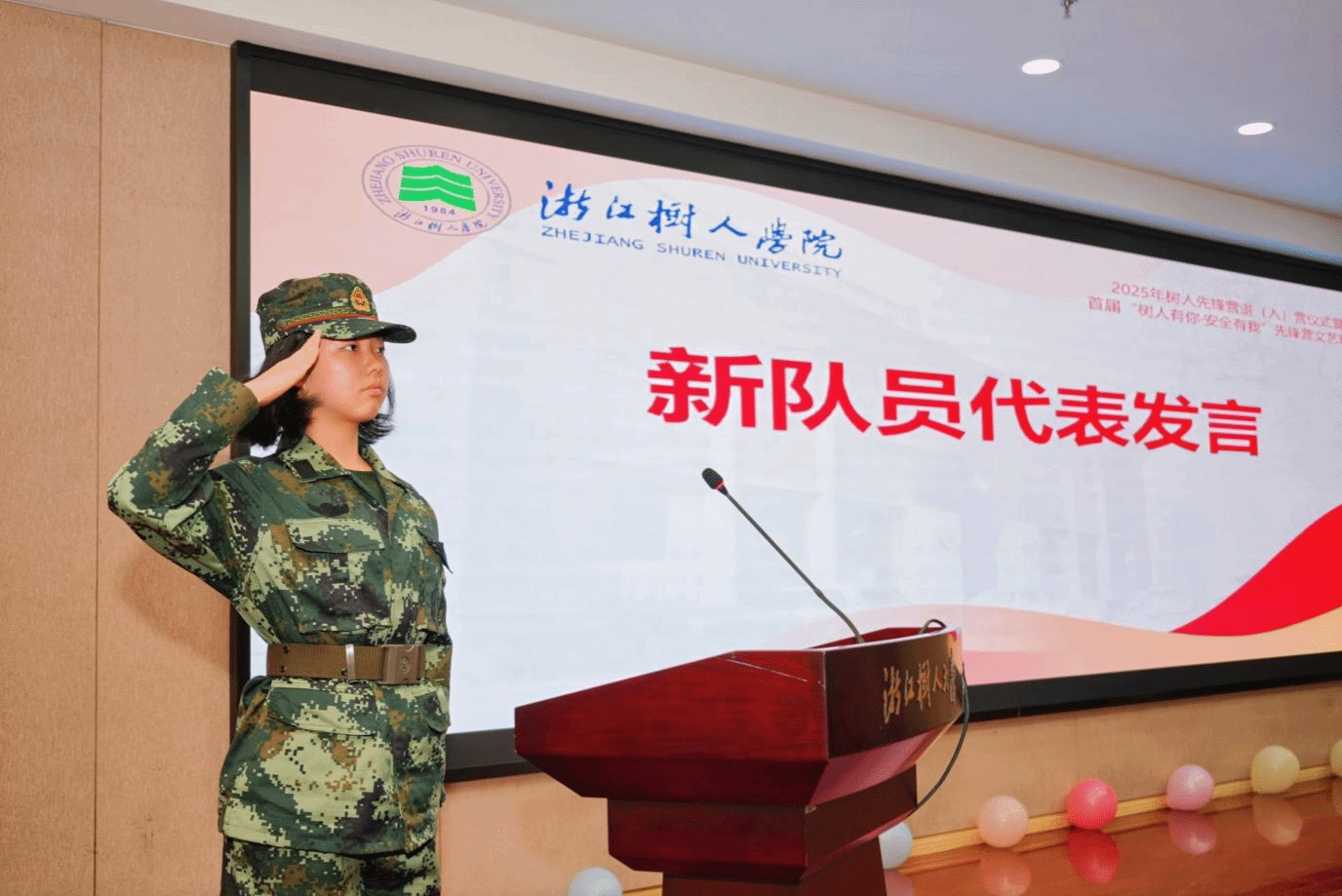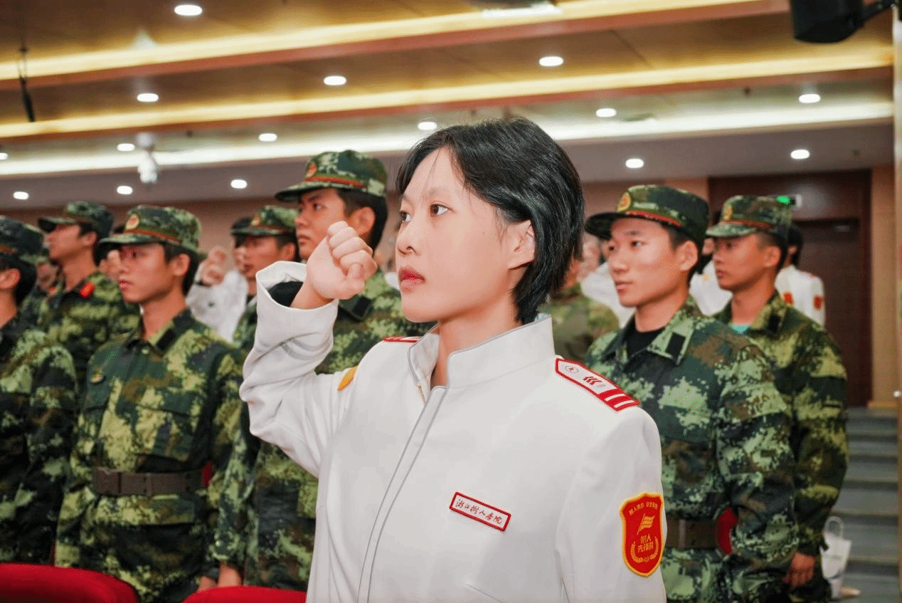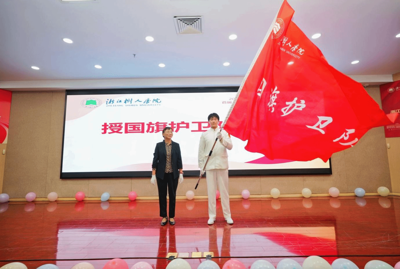 仪式现场同步举行浙江树人学院国旗护卫队成立仪式,冯淑娟为国旗护卫队授旗,浙江树人学院暨王宽诚教育基金会负责老师向先锋营、国旗护卫队赠送由基金会支持订制的全新礼服。全体国旗护卫队队员面向国旗庄严宣誓,承诺以军人作风守护国旗尊严。随后,党委安保部(人武部)部长吴杨铠宣读新一届先锋营、国旗护卫队学生干部聘任文件,并为他们颁发聘书。