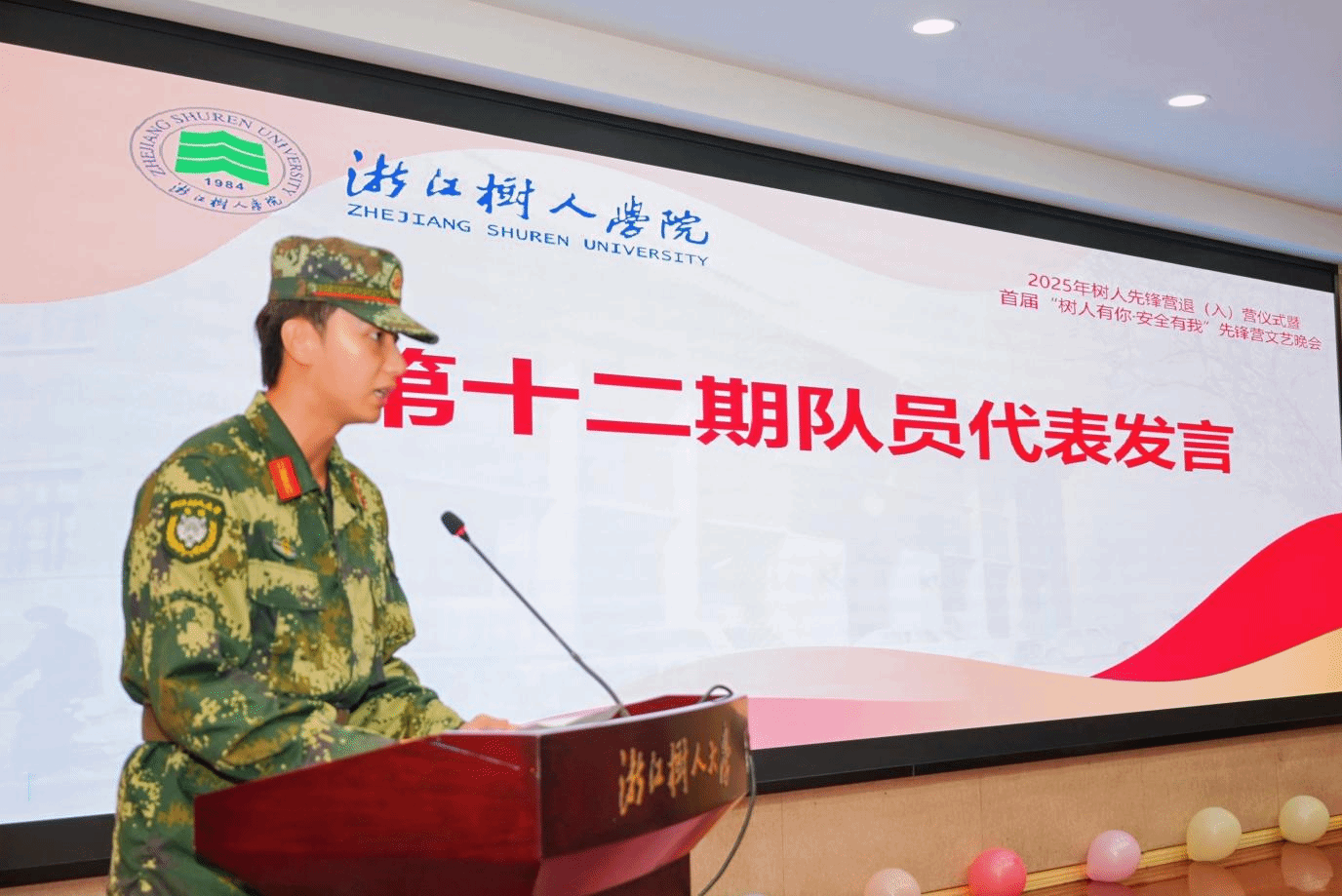 接着,冯淑娟进行了总结讲话。她回顾了先锋营一年以来所承担的各项学校事务工作,并对先锋营营员在服务师生的同时,专业学习、个人成长方面所取得的成绩给予了充分肯定。她对往届先锋营成员的辛勤工作表达了感谢,同时也对所有队员提出了三点要求:一是要初心铸魂强信念,争做有责任敢担当的新时代青年。希望大家以知识筑牢青春根基,以公德涵养品格修为,以明辨把握人生方向,以笃实书写奋斗篇章,用坚定的信念、过硬的本领,扛起时代重任,做有担当的时代青年。二是要精神传承树新风,共建讲团结有活力的高质量团队。全体营员要用心延续先锋营的优良传统,不断拓展服务内容、提升服务品质,在无私奉献中彰显树人学子的良好形象,让树人先锋营持续成为学校社团组织里一张亮眼的“金名片”。三是要先锋领航提素养,塑造敢突破求卓越的最好的自己。要把部队中“不怕苦、不怕累、敢攻坚、勇向前”的精神,作为人生信条,用书籍充实头脑,用实践锤炼本领,在逆境中磨砺意志,在成长中突破自我,努力塑造“最好的自己”。讲话最后,她还就秋冬季高发的安全隐患问题进行了提醒,希望同学们共同推进平安校园的建设。