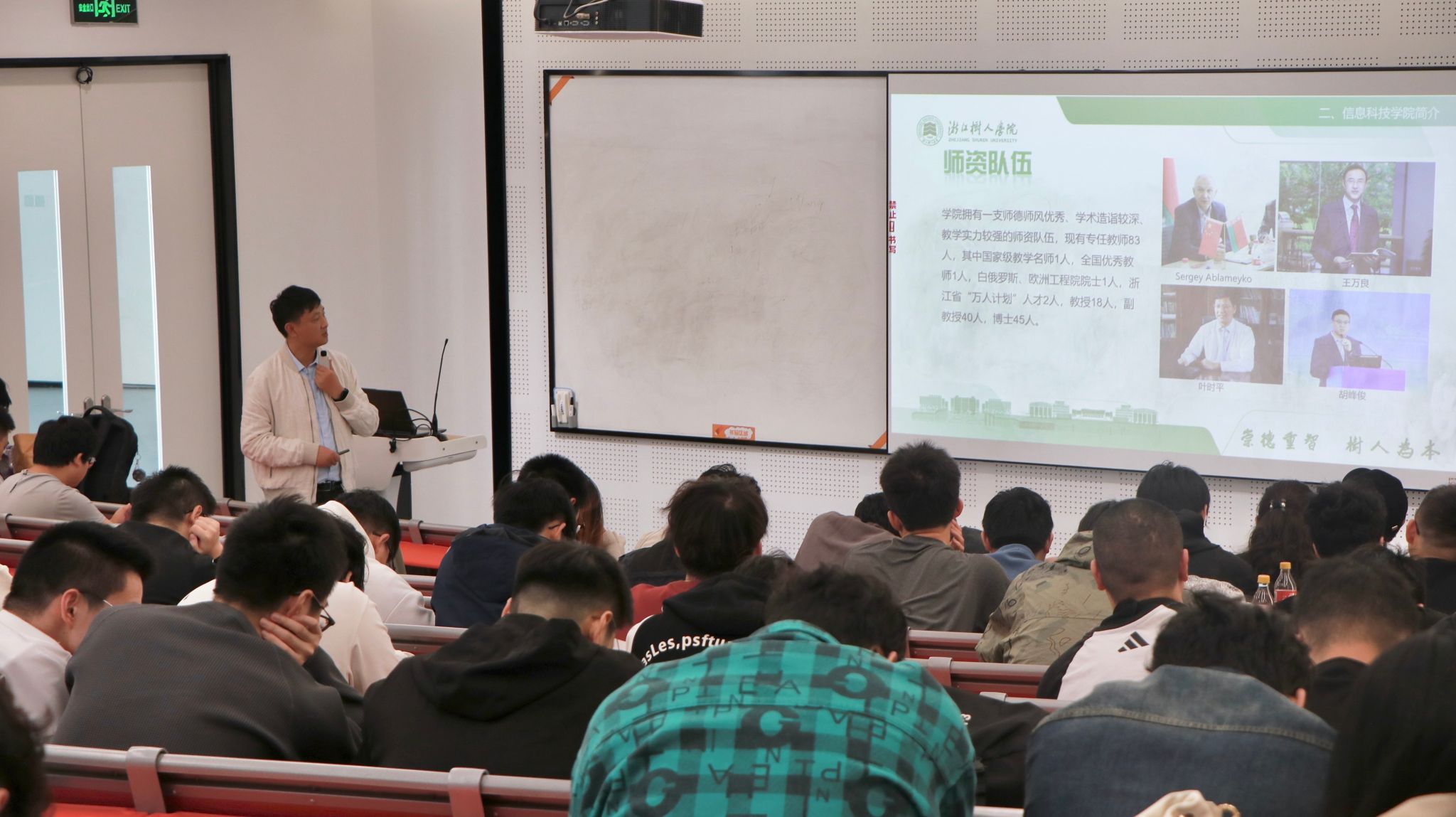 宣讲会伊始,戴国勇代表信息科技学院对宁波财经学院数字技术与工程学院的统筹协调表示感谢,并围绕 “学校优势 — 学院特色 — 学位点实力” 三维度展开主讲。在学校层面,他详细介绍了学校的办学定位、学科布局、科研平台及人才培养体系,重点提及学校在信息领域的学科优势与产学研融合成果,让学生直观感受学校的学术氛围与发展潜力;学院层面,他从师资力量、科研团队、教学资源等方面切入,结合学院近年来在技术攻关、学科竞赛中的亮眼成绩,展现信息科技学院的育人实力与学科特色;电子信息学位点介绍环节,戴国勇聚焦学位点的培养目标、三个招生方向以及实践基地,阐述了学位点在培养 工程技术创新人才方面的优势,为学生勾勒清晰的学业发展路径。