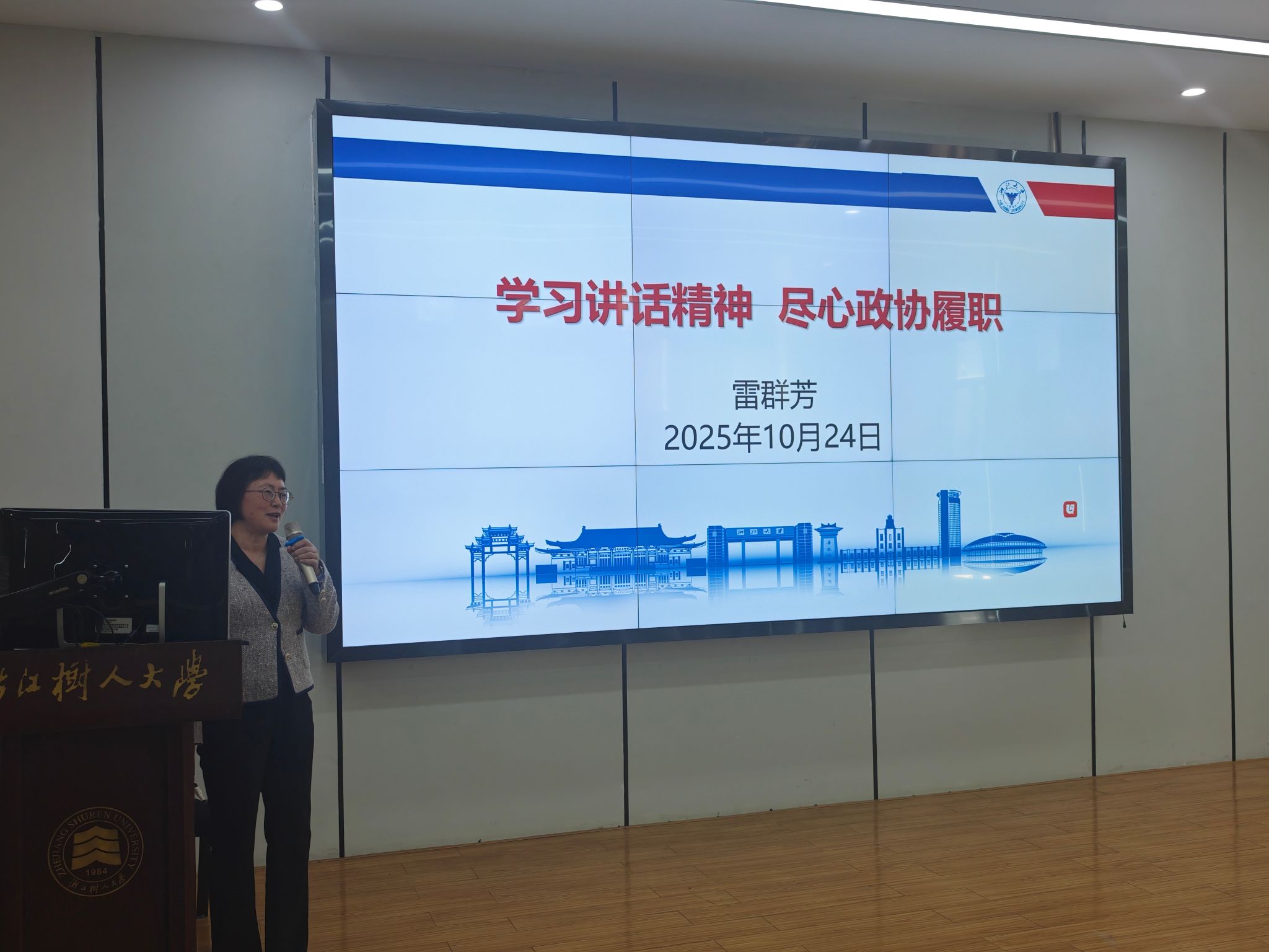 10月24日下午,由生物与环境工程学院承办的浙江树人学院“同心汇”政协委员大讲堂在B2-103举行。本次讲座特邀第十四届全国政协委员、浙江大学继续教育学院副院长、杭州市上城区人大代表雷群芳教授作题为《学习讲话精神 尽心政协履职》的专题报告,吸引了全院教师100余人现场聆听。讲座由学院党委书记应海儿主持。