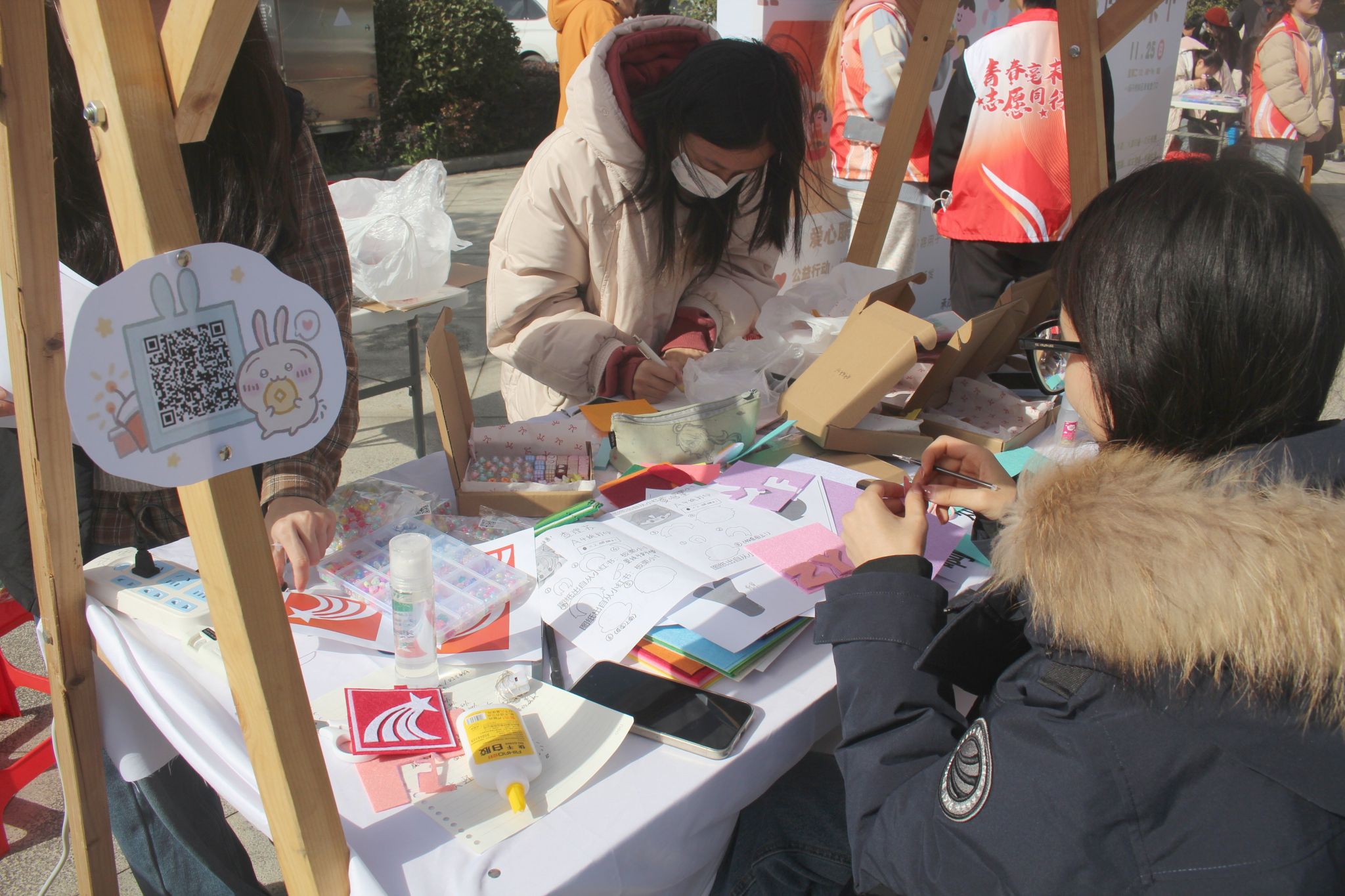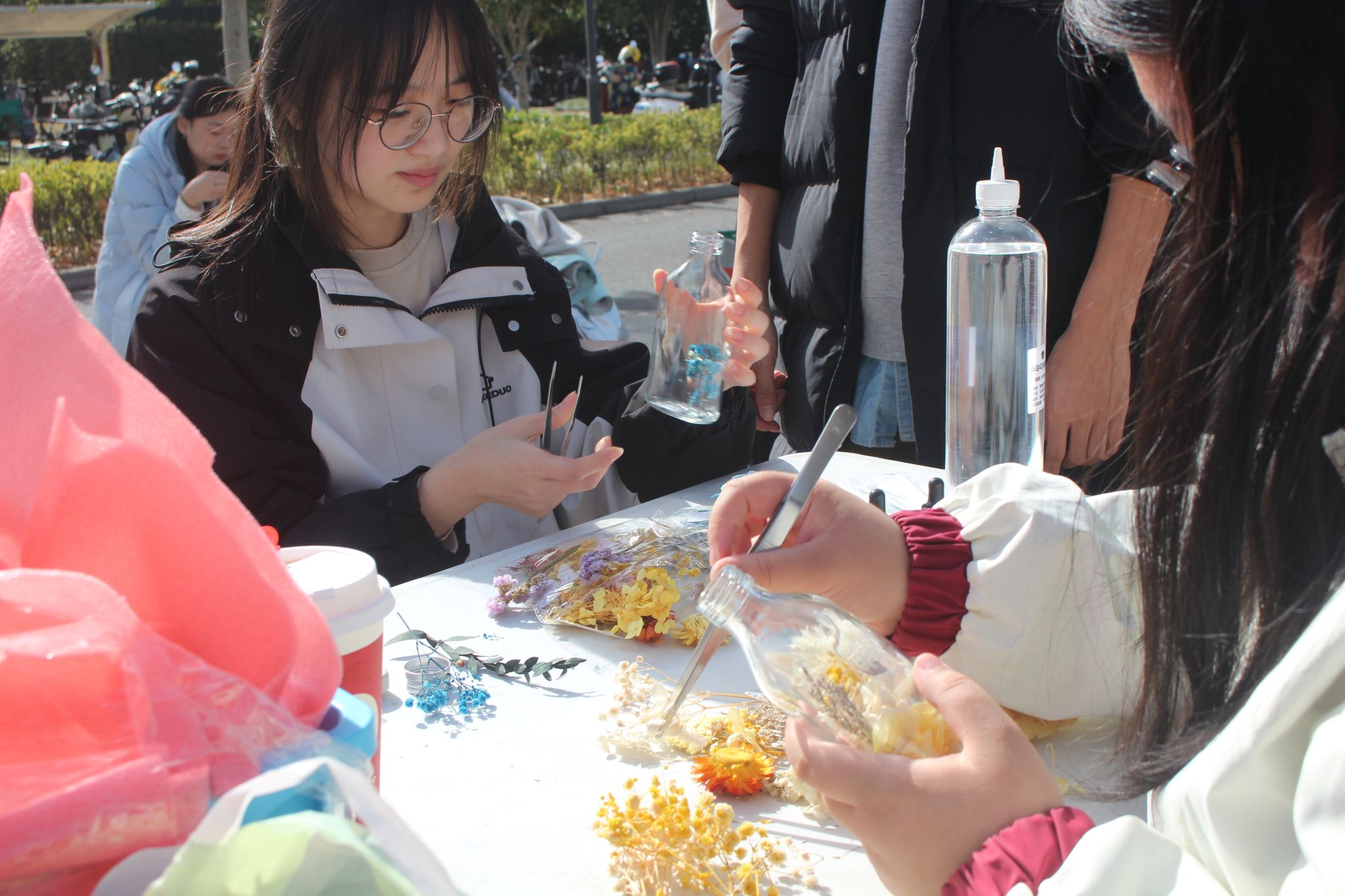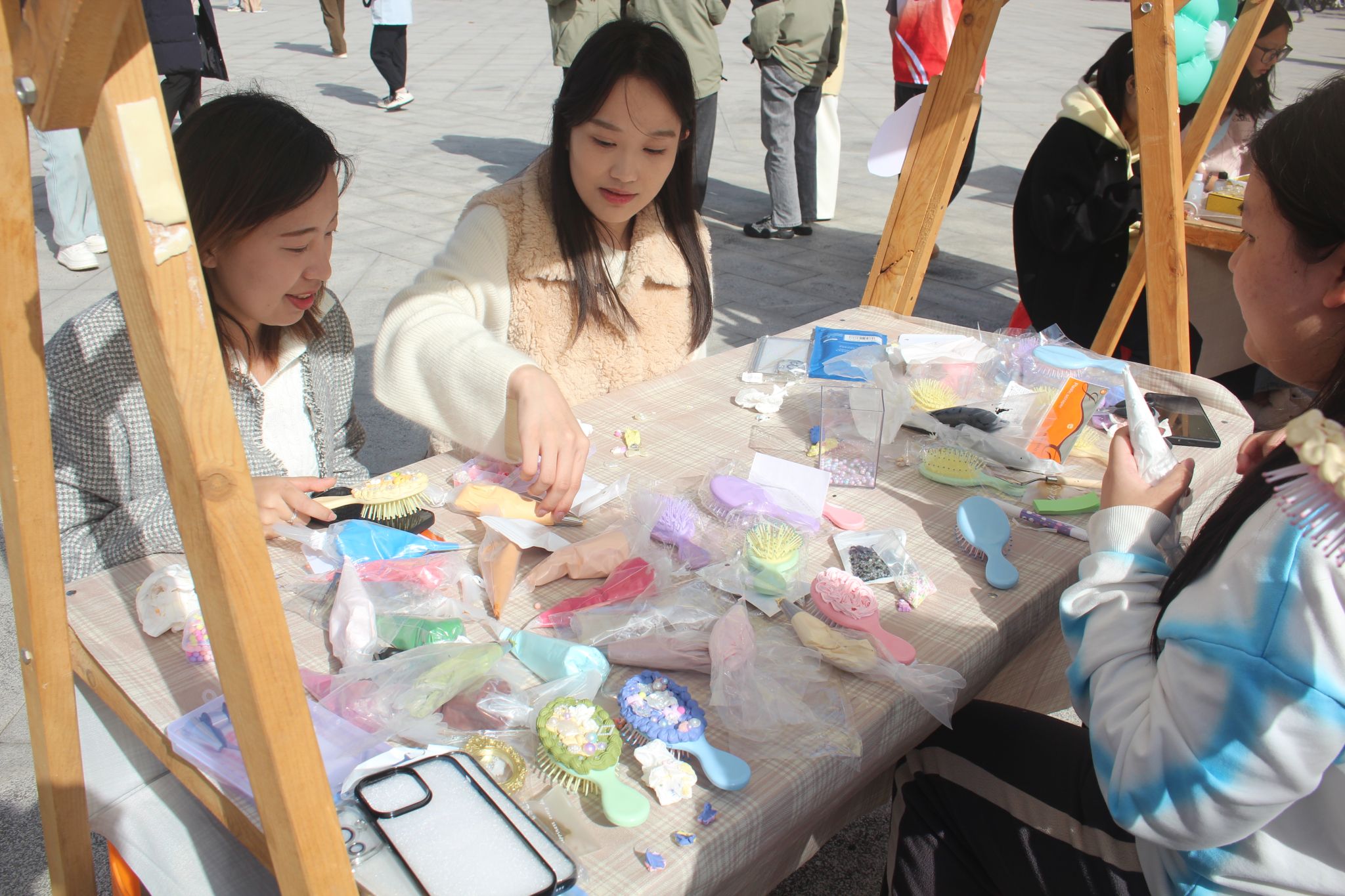 本次集市设置"舌尖甜趣""手作治愈""DIY体验""非遗传承"四大主题区域。"舌尖甜趣"区汇集了古法糖"串起童年甜铺"、烤肠"滋滋烤肠铺"和手作饼干"手工创造美味"三个摊位,传统与现代风味交织让师生们大快朵颐。"手作治愈"区的拼豆"像素狂想曲"、不织布"布语拾光"、羊毛织物"暖绒森活"和果壳铃"果壳里的风与诗"四个摊位,用细腻工艺传递温暖情感,其中不织布还原的温馨场景和羊毛织物勾勒的冬日元素尤其受到欢迎。"DIY体验"区提供奶油胶"甜心手作小屋"、迷你食玩"指尖烘焙屋"、火漆"次元绮遇"三项互动体验,同学们在亲手制作过程中感受创造乐趣,火漆制作摊位前更是排起长队,大家纷纷用独特印章封存专属心意。"非遗传承"区则通过书法"非遗书韵"、园林"青衿园韵"、中国风螺钿"钿饰芳华"、浮游瓶"瓶藏非遗"和剪纸"纸韵红心"五个摊位,展现传统文化魅力,书法挥毫的笔墨韵味、螺钿镶嵌的古典雅致、剪纸艺术的红色情怀,让师生们沉浸式体验非遗技艺的博大精深。