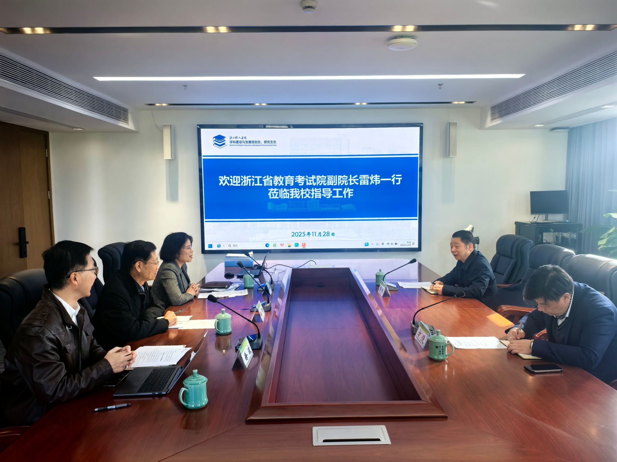 11月28日上午,浙江省教育考试院党委委员、副院长雷炜一行莅临我校,专题调研指导2026年全国硕士研究生招生考试自命题工作。校纪委书记王方参加实地检查环节,校学术委员会常务副主任陈智、研究生处负责人及相关工作人员参加调研活动。
