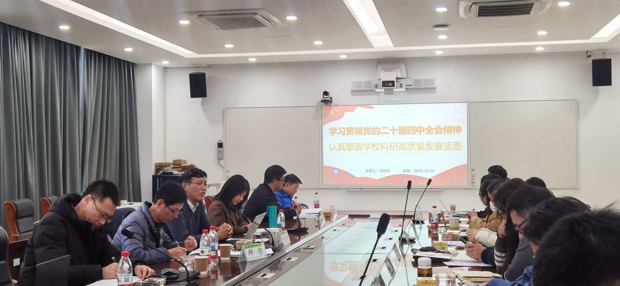 随后,叶时平以“认真擘画学校科研高质量发展蓝图”为题,专题宣讲党的二十届四中全会精神。他深入解读了全会关于科技自立自强、发展新质生产力的战略部署,系统回顾了学校“十四五”科研成就,分析了当前机遇与挑战。针对“十五五”发展,他指出,科研工作应坚持长远布局与短期目标结合,以服务国家战略和区域需求为导向,持续优化学科布局,强化有组织科研,重点布局低空技术、智能建造、绿色建筑等交叉领域,建强平台团队,推动产学研深度融合与成果转化。