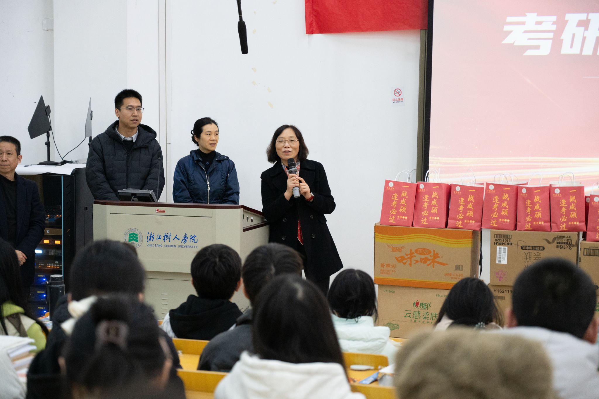 活动现场暖意融融,冯淑娟代表学校发表讲话。她首先对同学们在备考过程中展现出的坚韧毅力与拼搏精神给予高度肯定,面对即将到来的考试,她勉励同学们在最后冲刺阶段保持昂扬斗志,以沉稳状态和最佳状态迎接挑战,衷心祝愿每一位同学金榜题名。结合多年教学与育人经验,冯淑娟为同学们送上三点核心备考建议:一是科学分配时间,实现学习、休息与运动的动态平衡,通过制定合理作息计划保障充足睡眠,借助轻度运动调节身心状态,为高效冲刺筑牢基础;二是精准补齐短板,对照考试大纲系统梳理知识体系,聚焦薄弱科目与易错题型,通过错题复盘、针对性训练等方式查漏补缺,稳步提升整体应试能力;三是理性选择院校,珍惜第一志愿报考机会,同时做好备选方案规划,以平和心态看待考试结果,重视每一个读研深造的可能。她强调,学校始终是同学们最坚实的后盾,将全力为大家的备考与应考提供全方位支持保障,期待每一位同学稳扎稳打、沉着应战,让每一份努力都落地见效。