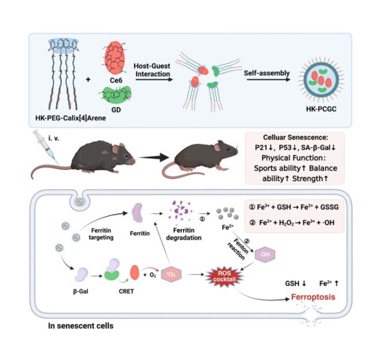 此次研究团队开发的抗衰老前药HK-PCGC,其核心由三部分组成:一种可精准靶向并被衰老细胞特异性激活的探针(GD)、一种光敏剂(Ce6)和一种可激发细胞铁死亡的铁蛋白肽(HK)。其核心创新在于能够像“智能导弹”一样,精准识别衰老细胞特有的生物标志物,并在衰老细胞启动“双重打击”:即通过激活Ce6光敏剂产生大量活性氧攻击衰老细胞,并通过劫持铁蛋白精准诱导衰老细胞铁死亡。