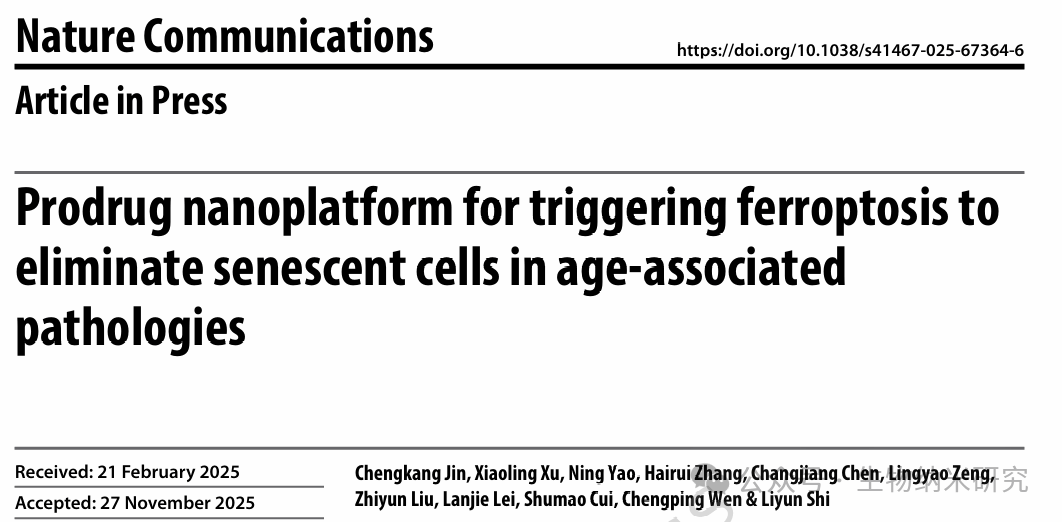 近日,转化医学研究院史丽云教授团队在国际知名期刊《Nature Communications》上发表了题为《Prodrug nanoplatform for triggering ferroptosis to eliminate senescent cells in age-associated pathologies》的研究成果。该研究开发出一种能够精准识别并清除体内“僵尸细胞”的纳米平台,为延缓衰老及相关疾病治疗提供了全新的思路和潜在工具。