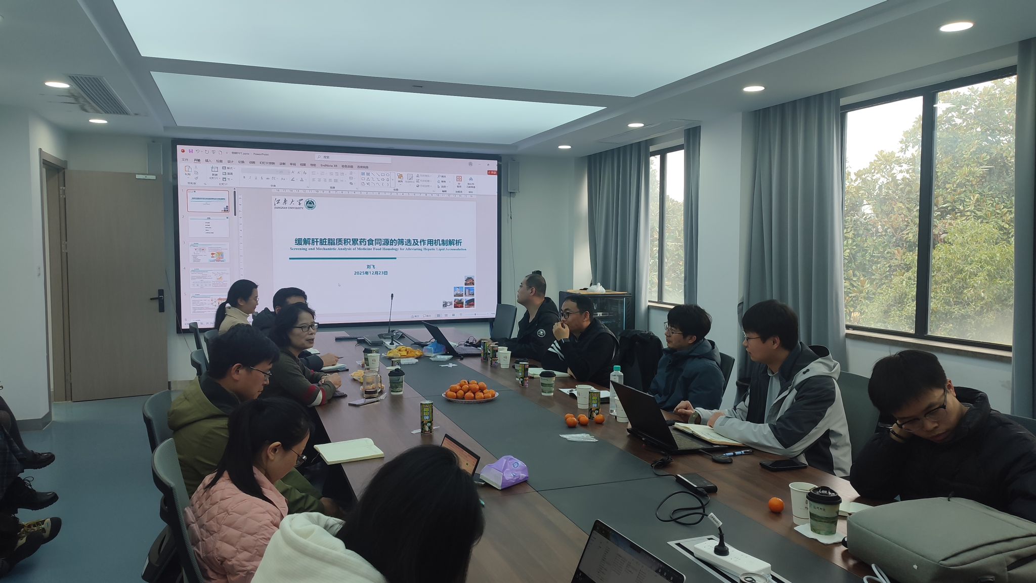会议中,江南大学毛丙永教授、唐鑫研究员和刘飞博士后进行了相关课题的汇报交流。毛丙永教授聚焦于药食同源依赖的肠道菌群筛选及其对非酒精性脂肪肝的治疗作用。通过转录组学、代谢组学分析,以及 DARTS 解析结合蛋白等先进手段,团队验证了肠道优势菌代谢产物靶向干预肝脏脂质合成的分子机制,并揭示了药食同源中草药单体成分与益生菌配伍的转化应用前景。这一研究为预防和改善肝脏相关疾病提供了新的治疗策略。