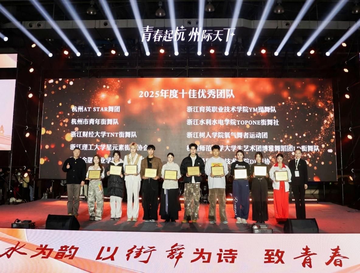 12月28日,在浙江省街舞运动协会的指导下,由杭州市街舞运动协会主办,共青团浙江省街舞运动协会工作委员会、杭州市街舞运动协会大学生事务委员会承办的“青春起杭 州际天下”2025年杭州市大学生年度颁奖盛典暨“星浪奖”青年街舞专项扶持奖项启动仪式在杭州职业技术大学落下帷幕,我校社团氧气舞者运动团荣获2025年度十佳优秀团队荣誉称号。