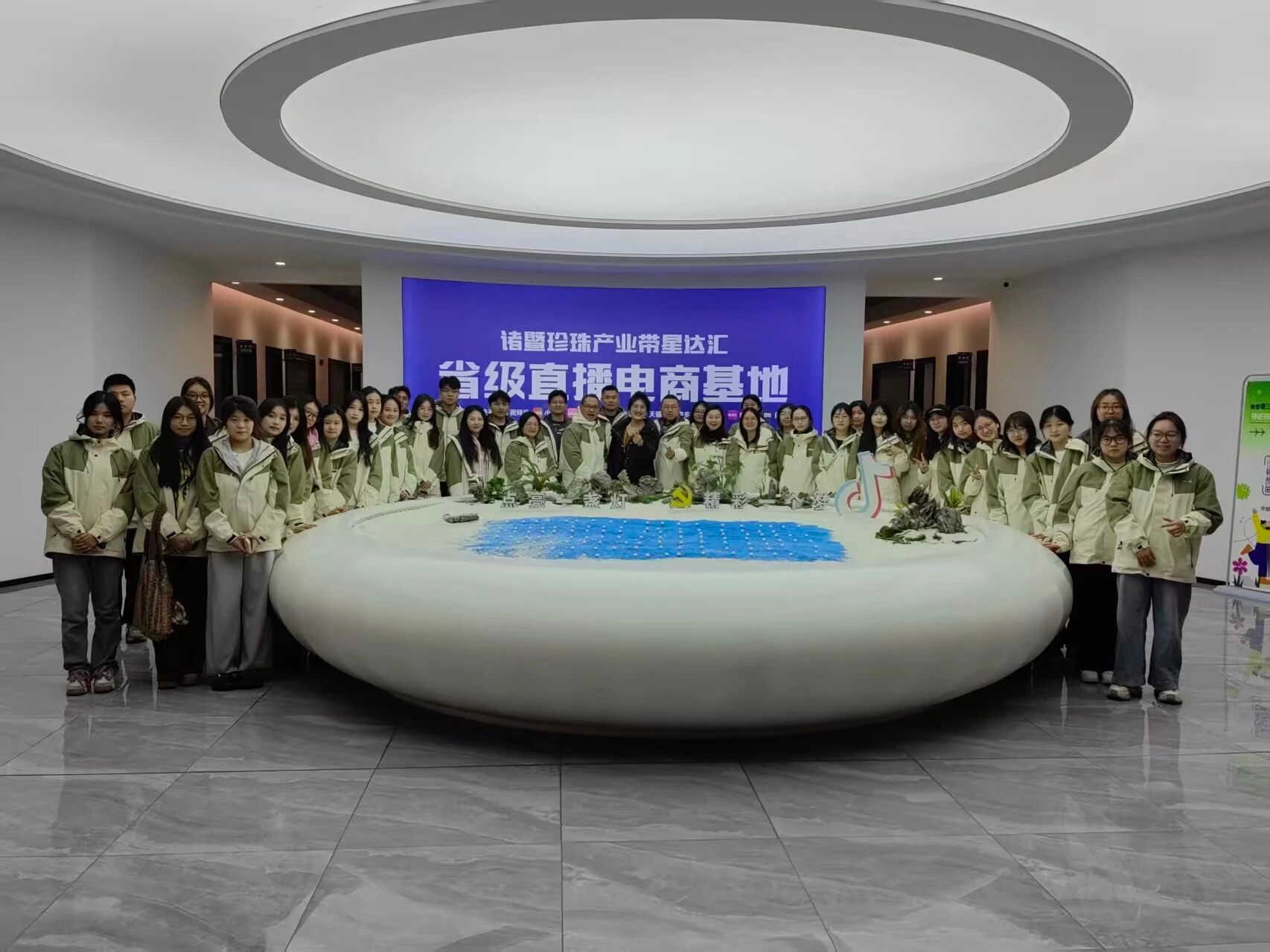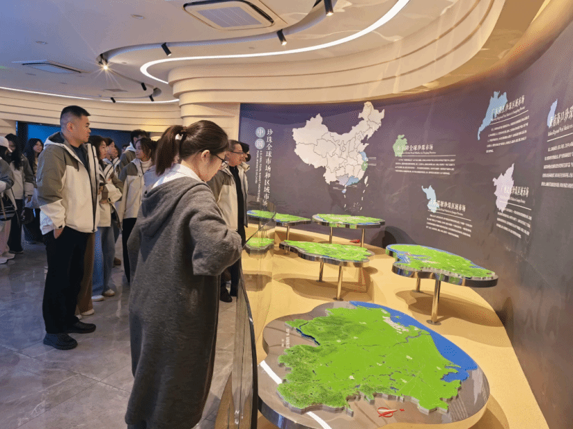 研习营首站聚焦“中国珍珠之都”诸暨,开启沉浸式产业链调研。师生们首先走进我国首座世界淡水珍珠博物馆——诸暨珍珠博物馆,全方位了解珍珠历史文化、成因机理与养殖技术,深刻感受珍珠从沙砾到珍宝的蜕变历程。随后,一行人前往被誉为“珍珠第一村”的新长乐村,通过村史馆里的泛黄照片了解百年养殖史的变迁,村民们坚守的匠心让师生们动容。诸暨调研最后一站,师生们探访华东国际珠宝城与星达汇省级直播电商基地。作为国内重要的珍珠产业集散中心,珠宝城内淡水珠、海水珠等品类齐全,资深匠人的精细分拣彰显深厚工艺积淀;而一街之隔的直播基地则通过多平台直播间与数字化仓储的“前播后仓”模式,实现珍珠产业与数字经济的深度融合,为传统产业注入新动能。