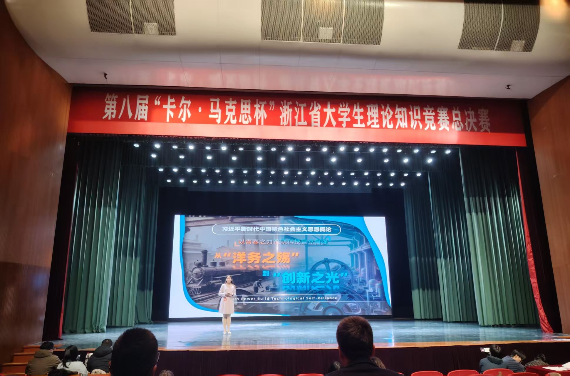 决赛阶段设置“思政知识竞赛”与“大学生讲思政课”两大环节:前者通过理论知识竞赛的方式考查理论功底,后者要求选手以 6 分钟微课形式展现理论应用能力,试题涵盖习近平新时代中国特色社会主义思想、党史党建、浙江实践等核心内容。赛场上,我校队员牢记嘱托,沉着应战。在“讲思政课” 环节中,本科组代表郑昕同学以“从‘洋务之殇’到‘创新之光’”为题,生动诠释了马克思主义理论在我国新时代科技创新领域的实践价值,赢得了评委们的认可。