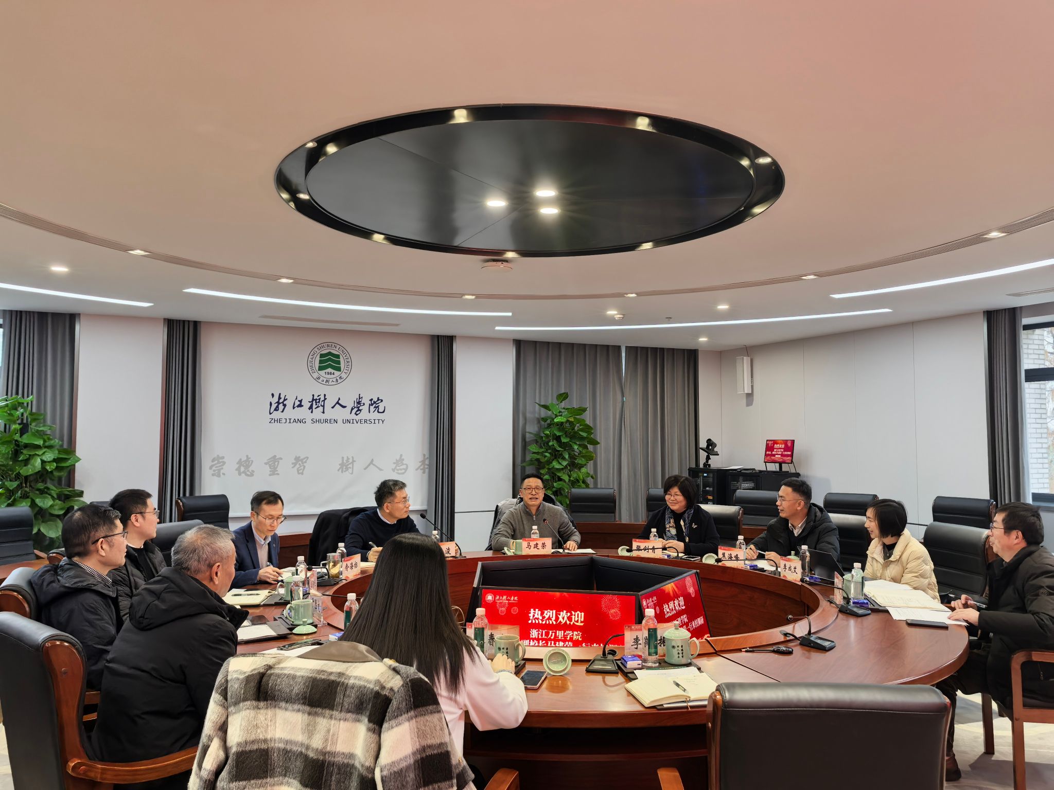 马建荣副书记对我校的热情接待表示衷心感谢,并介绍了浙江万里学院的基本情况、办学优势及此次调研的核心目的。他表示,去年浙江树人学院在本科审核性评估中展现出的扎实办学功底和鲜明发展特色,给他留下了深刻印象,因此新年伊始便将我校列为调研首站。此次来访,重点希望学习我校在后勤服务模式创新、物业管理(含学生宿舍租赁、食堂商铺运营、安保服务)采购机制、后勤服务公司化运营等方面的成熟经验,同时期待两校以此次调研为契机,建立常态化沟通机制,在契合双方发展需求的领域开展深度合作,携手助力高等教育事业高质量发展。