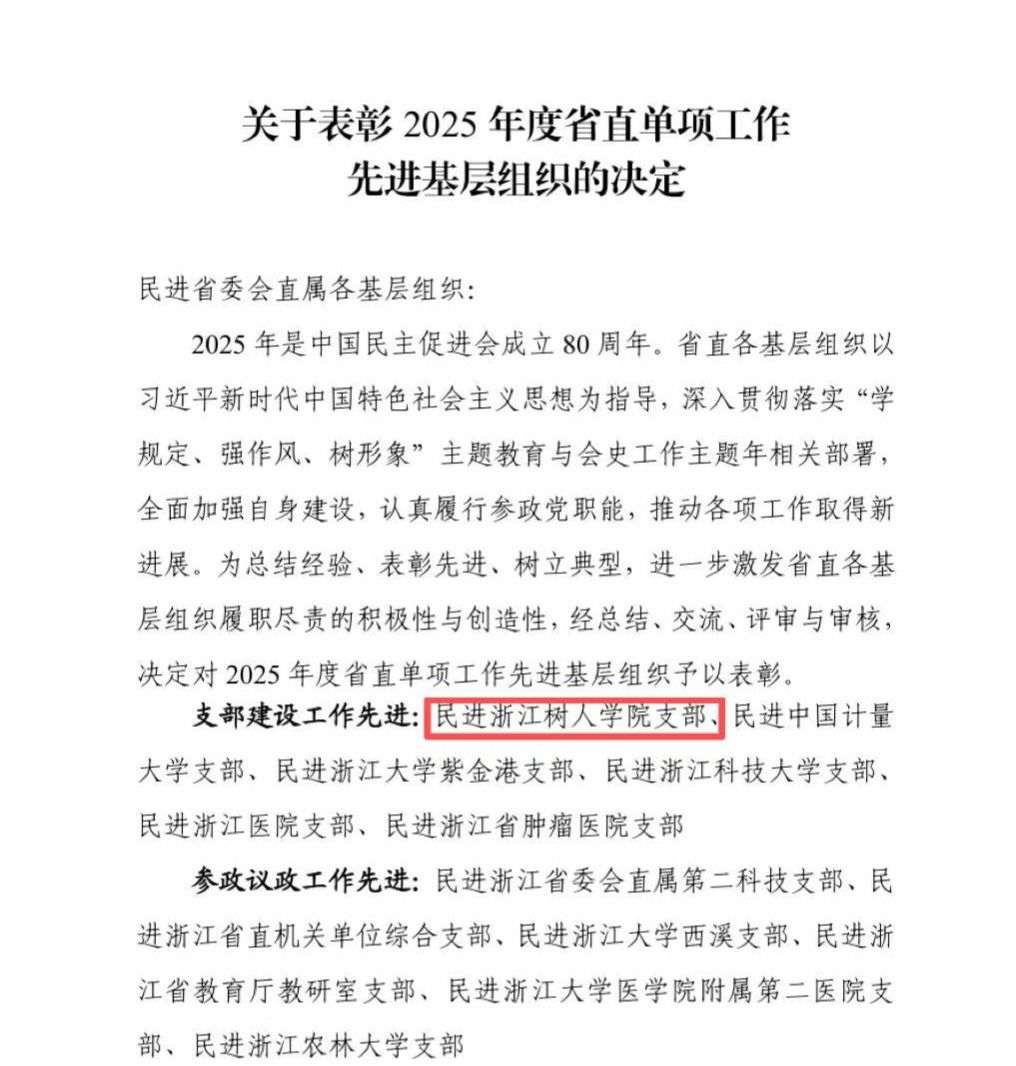 2025年是中国民主促进会成立80周年,为鼓舞和激励民进各级组织和广大会员奋勇争先、再建新功,近日,民进省委会发文对省直单项工作先进基层组织予以表彰。经申报评选,民进浙江树人学院支部获评“支部建设工作先进”。
