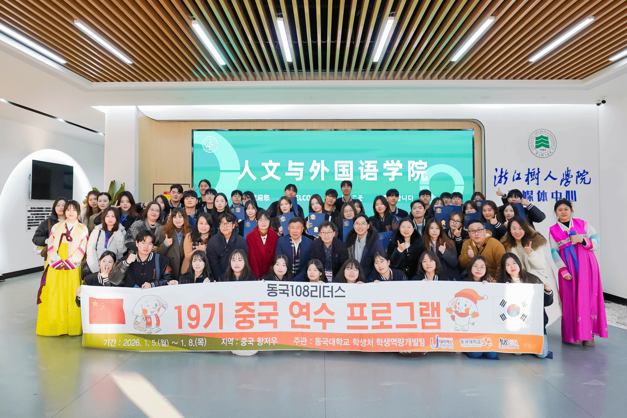 1月5日至8日,由韩国顶尖学府东国大学优秀学子组成的研修团抵达浙江,展开了为期四天的深度文化研学之旅。此次访问全程由我校人文与外国语学院朝鲜语专业的师生担任翻译与接待主力,他们以扎实的语言功底和专业的文化素养,保障了交流活动的顺畅与深度,充分展现了该专业在促进国际交往中的实践价值与桥梁作用。1月7日,研修团一行莅临我校杨汛桥校区,访问行程充实而富有成效,双方学子互动频繁,氛围热烈,屡屡发出“相见恨晚”的感慨。
