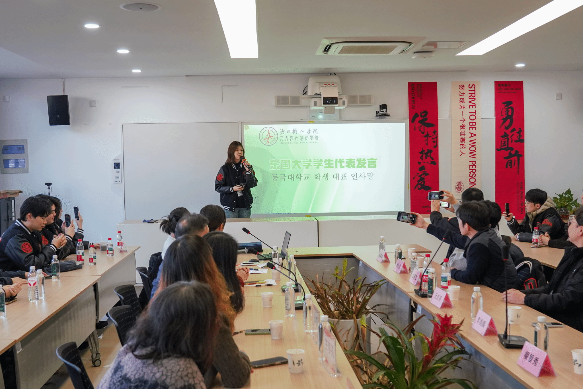 李剑亮院长在致辞中分享了个人与韩国的深厚渊源,引发了在场嘉宾的广泛共鸣。随后,双方师生代表畅所欲言。韩方教师与学生一致表示,此次杭州与树人学院之行收获远超预期,不仅深化了对中国的认知,更燃起了持续探索与合作的强烈意愿,回国后将积极推动更多交流项目。我校朝鲜语专业的学生代表则分享了与韩国友人相处的心得,表示通过此次高规格的接待与翻译实践,专业技能与跨文化沟通能力得到了极大锻炼,未来将继续担当好中韩友好使者的角色。