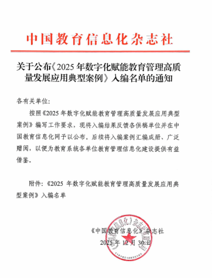 本次案例评选活动旨在系统梳理并推广教育数字化转型中的先进经验与典型模式,涵盖省市县及各级各类学校。经多轮评审,我校从全国500余个案例中成功跻身最终130个典型案例(其中高校教育管理高质量发展应用典型案例42个),将在《中国教育信息化》杂志、中国教育信息化网专题刊发,面向全国推广。