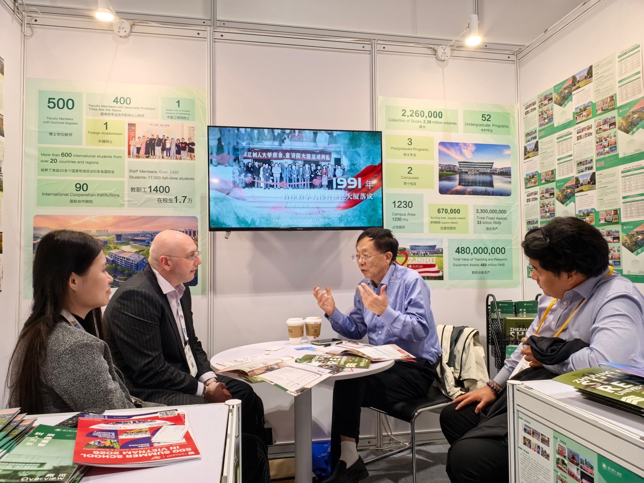 结合 “促进亚太区协作,共创全球教育新里程”的展会主题,我校代表团全面展示了学校在国际化人才培养、中外合作办学、产教融合、师生海外交流等方面的丰硕成果,介绍港澳台招生情况,凭借鲜明的应用型办学特色吸引了全球各地教育同仁的驻足交流。展会现场,代表团积极与来自爱尔兰、澳大利亚、新西兰、南非、荷兰、比利时、罗马尼亚、波兰、土耳其、新加坡、韩国、马来西亚、印尼、越南以及香港、澳门等20余个国家和地区的高校及教育机构代表深度对接,通过交换名片、发放资料、专题洽谈等方式,围绕联合培养、学分互认、教师互访、科研协作、学生交换等核心议题展开富有成效的交流,就多项合作意向尤其是申报合作办学机构达成初步共识。其中,与东南亚、欧洲等地区院校重点探讨了“4+0”“3+1”等联合培养模式的可行性,与香港本地高校就专业课程共建、短期交流项目进行细致磋商,与多家国际教育服务机构建立长效联系,为学校学子拓展海外升学、实习与就业渠道搭建了全新平台。