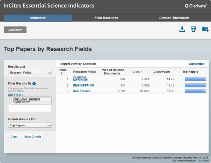 根据科睿唯安2026年3月12日ESI数据库公布的最新数据显示,我校工程学(Engineering)比预测提前一期进入ESI全球前1%机构排名,成为我校第二个跻身ESI排名的学科,标志着学校学科建设取得新的重大突破,核心学科的国际学术影响力再获权威认可。目前我校已有临床医学和工程学两个ESI学科进入全球前1%排名。