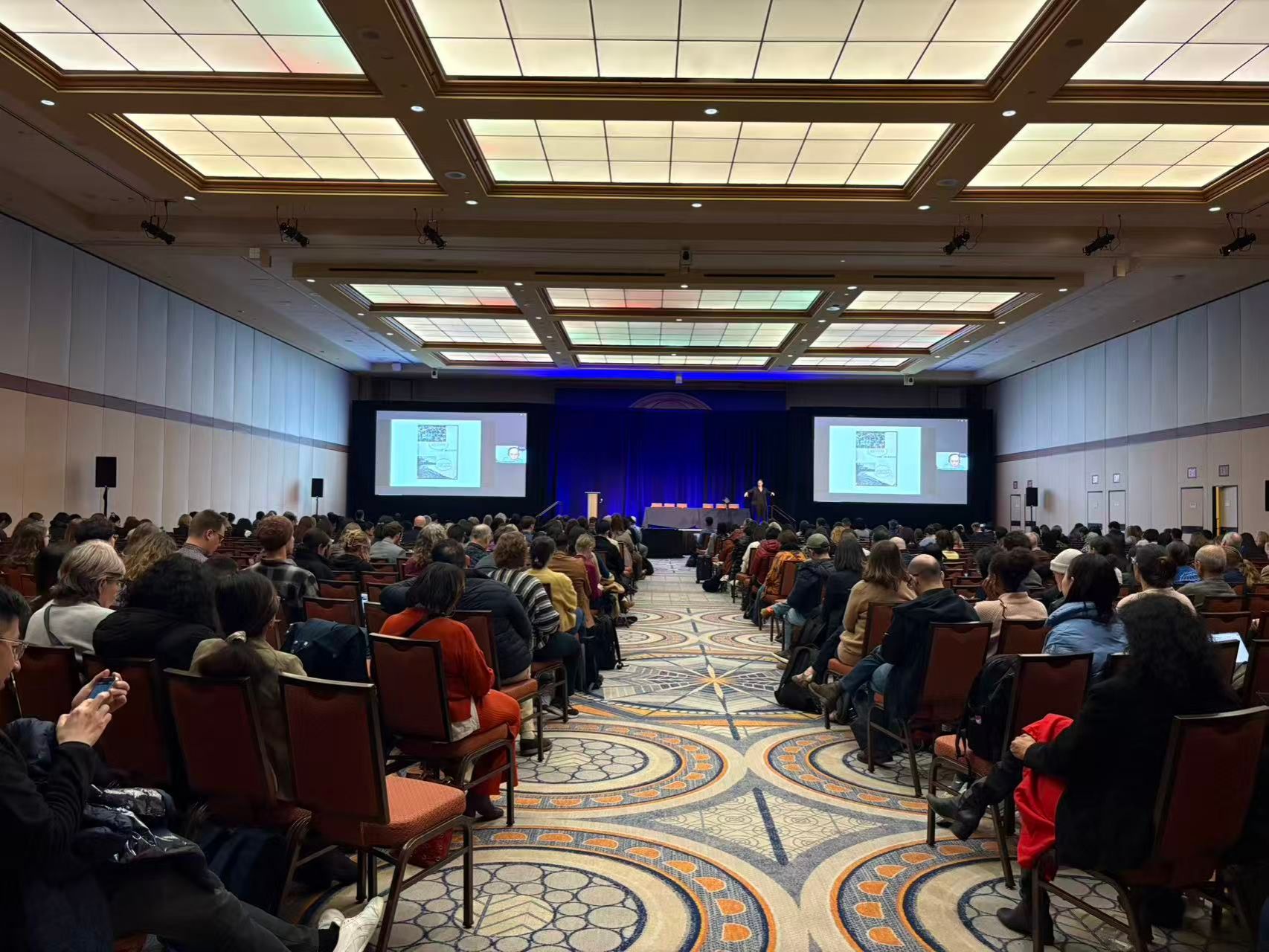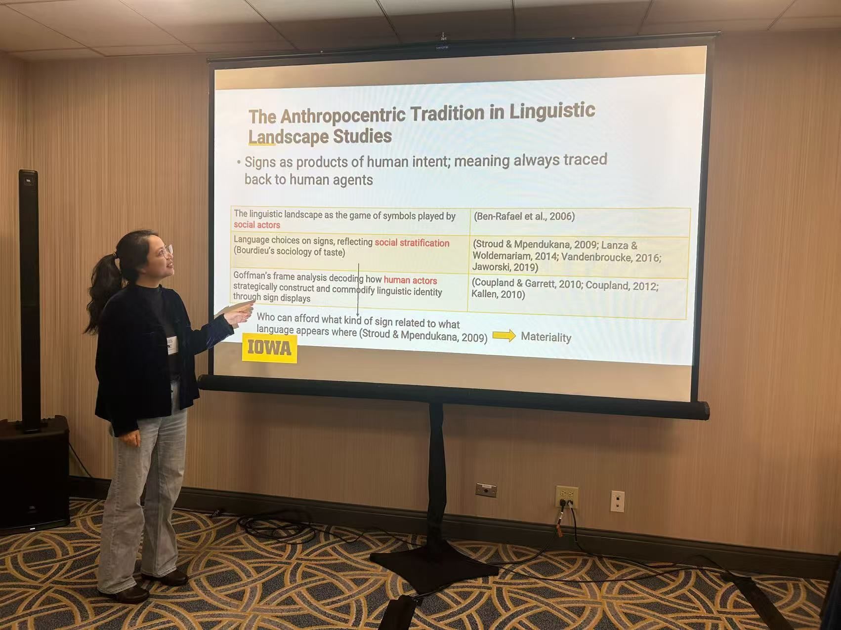 经过大会严苛的评审遴选,杭亚静老师成功入选论文报告环节,以Writing on Stable Ephemerality: Water-soluble Chalk as an Actor in the Network of Controversial Political Expression on Campuses in Iowa(《稳定的瞬态性:粉笔作为爱荷华州大学校园公共传播网络中的能动者》)为题,向全球与会学者分享了她的最新研究成果。报告立足校园公共场域的语言景观,深入探讨书写材料和气候在公共传播中的介质能动性。研究视角独特、引发了现场国际学者的广泛关注与深入交流。