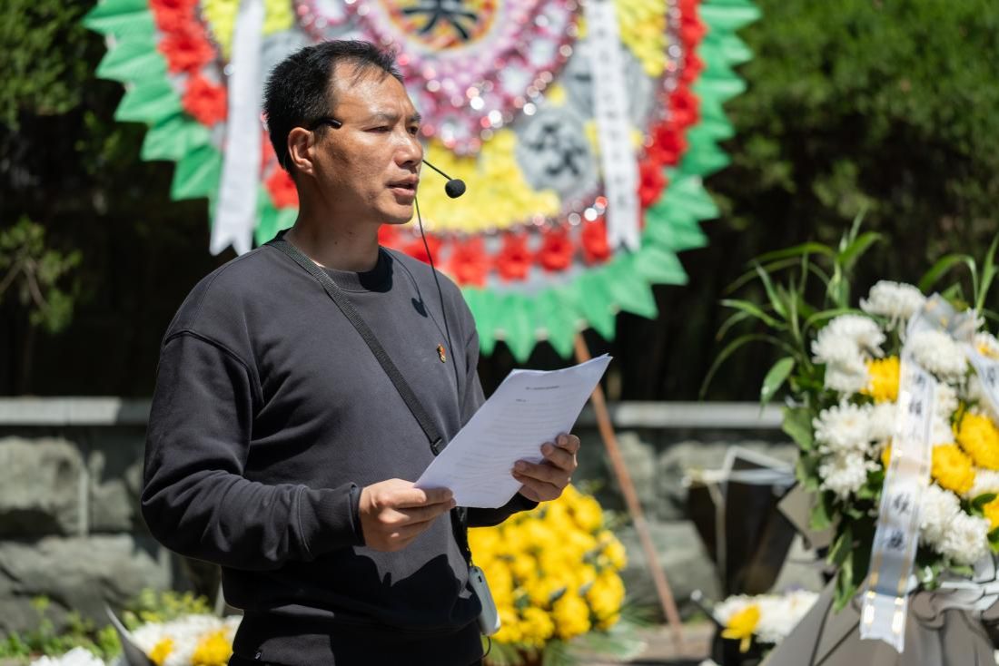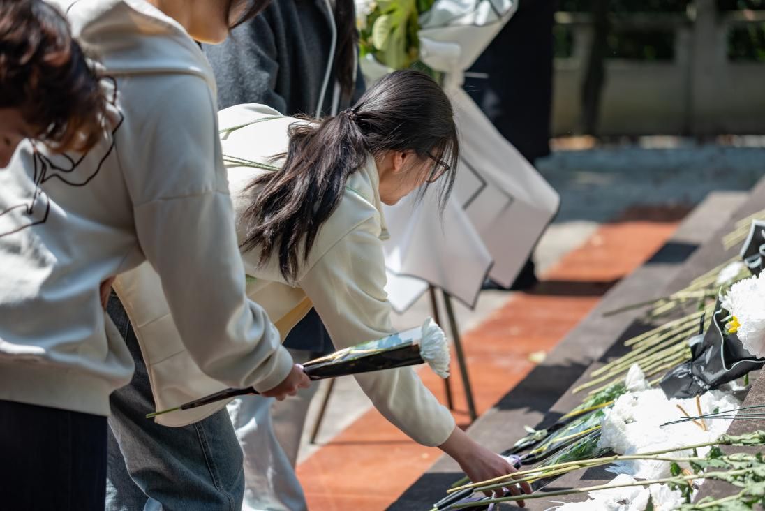 由“中特研读会”社团干部杨蔡睿同学主持,悼念仪式在雄壮的国歌声中拉开帷幕,学生代表手捧洁白的菊花,缓步走到墓碑前献礼,一朵朵菊花寄托着师生们对革命先烈的深切缅怀与崇高敬意。