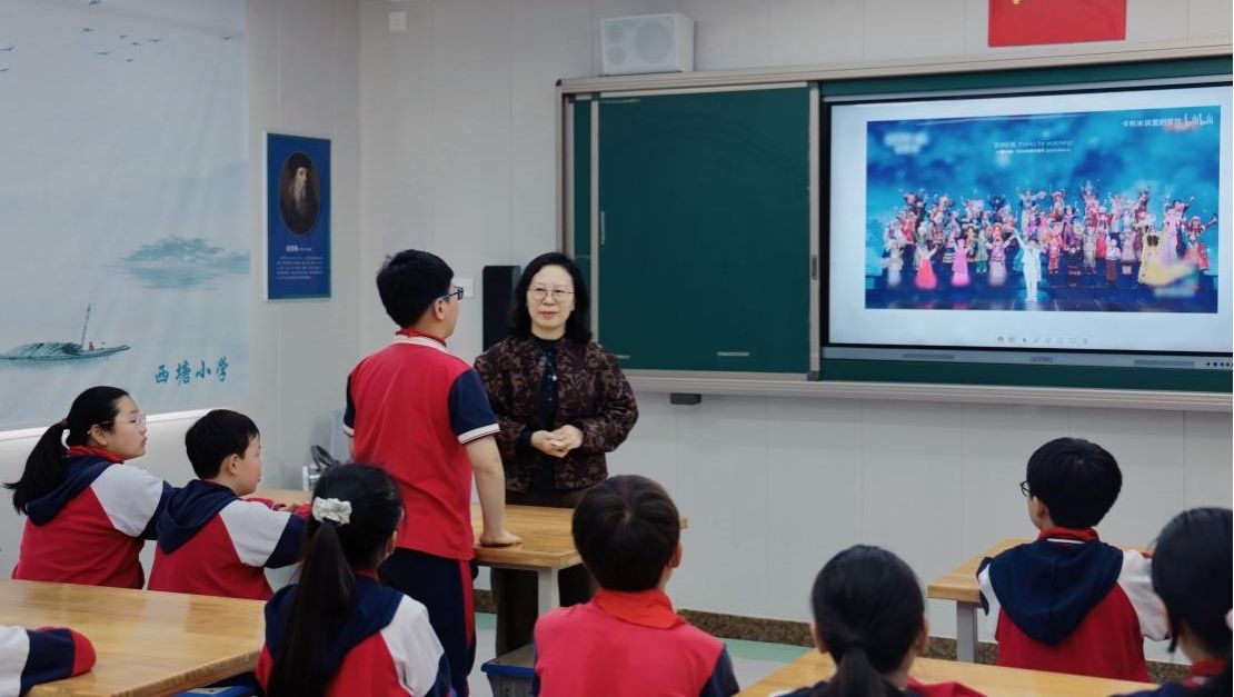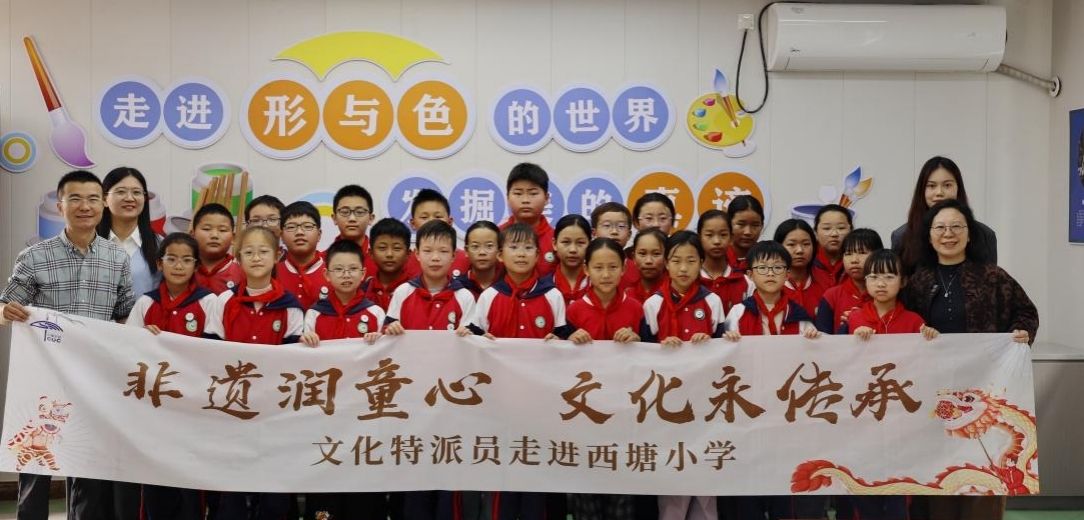 同日上午,郑桂玉教授随带研究生一起走进西塘小学,为孩子们带来了一场生动有趣的非遗启蒙之旅。授课中,她以通俗易懂的语言,让孩子们了解什么是非遗?中国有哪些列入世界非遗?再从中国刺绣艺术让孩子们直观感受到传统手工艺人的匠心与魅力。随后以春晚的《吉量》让孩子认识到一位苗族青年古阿新在非遗文化中责任与担当,用自己的力量弘扬民族大团结,让56个民族走上央视春晚。最后,将话题转向吕家埠村的“小敲”“耙棒会”等11项非遗,引导孩子们如何身体力行“传承家乡非遗”,现场互动频繁、氛围热烈,在轻松愉悦中在孩子们心田播下了文化传承的种子。最后,郑老师与西塘小学校长、街道主任就非遗“耙棒会”融入课间操的设想达成共识。