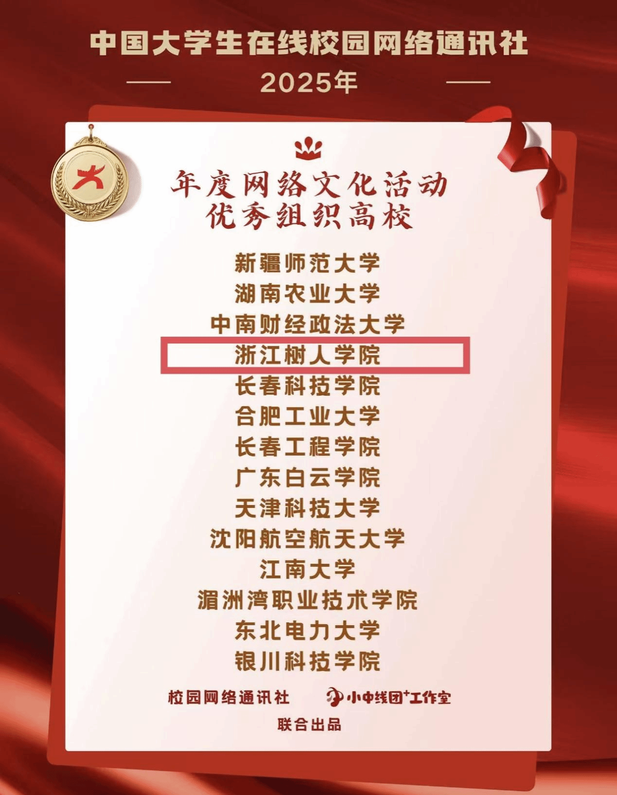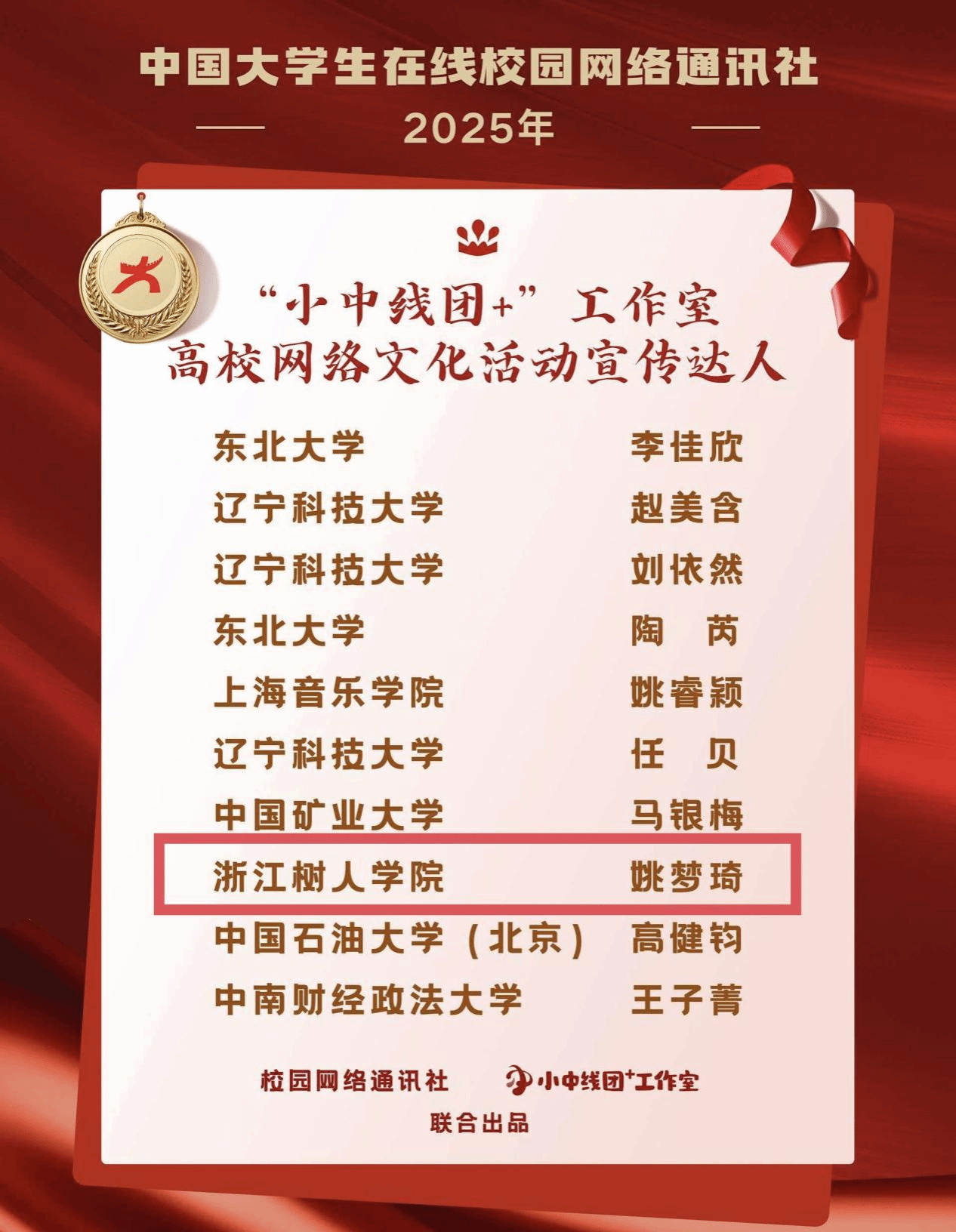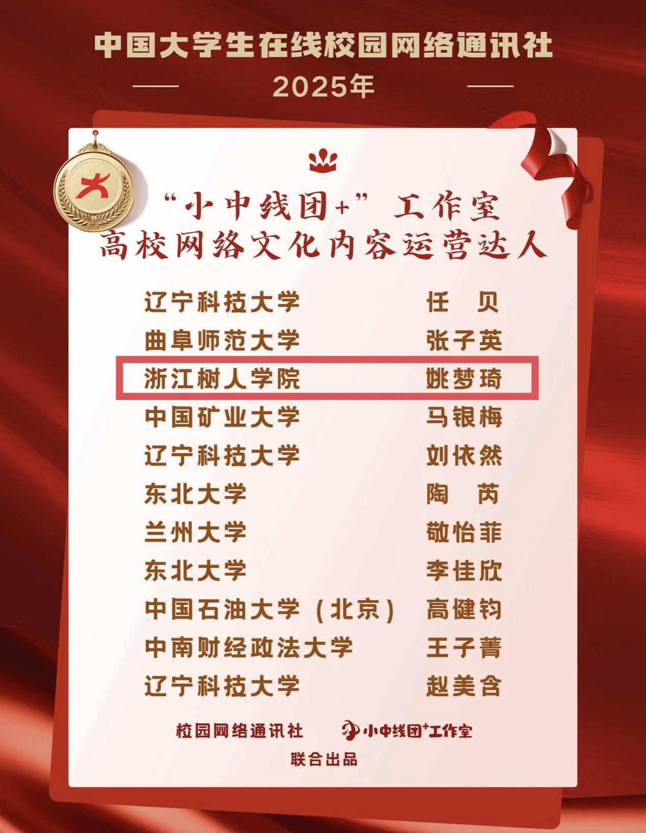 近日,教育部中国大学生在线公布了2025年度表彰名单。其中,浙江树人学院全媒体中心荣获“年度校网通站”“年度网络文化活动优秀组织高校”;学校党委宣传部副部长曾晓江老师获“校园行活动年度指导教师”;全媒体中心主任何怡雯老师获“‘中线团+’工作室年度指导老师”“年度指导老师”;全媒体中心学生陈彤彤、王雨婕获“年度学生通讯员”;姚梦琦获评“‘小中线团+’工作室高校网络文化内容运营达人”“‘小中线团+’工作室高校网络文化活动宣传达人”等9项荣誉。这是学校在2020年以来连续第5年获得中国大学生在线多项荣誉。