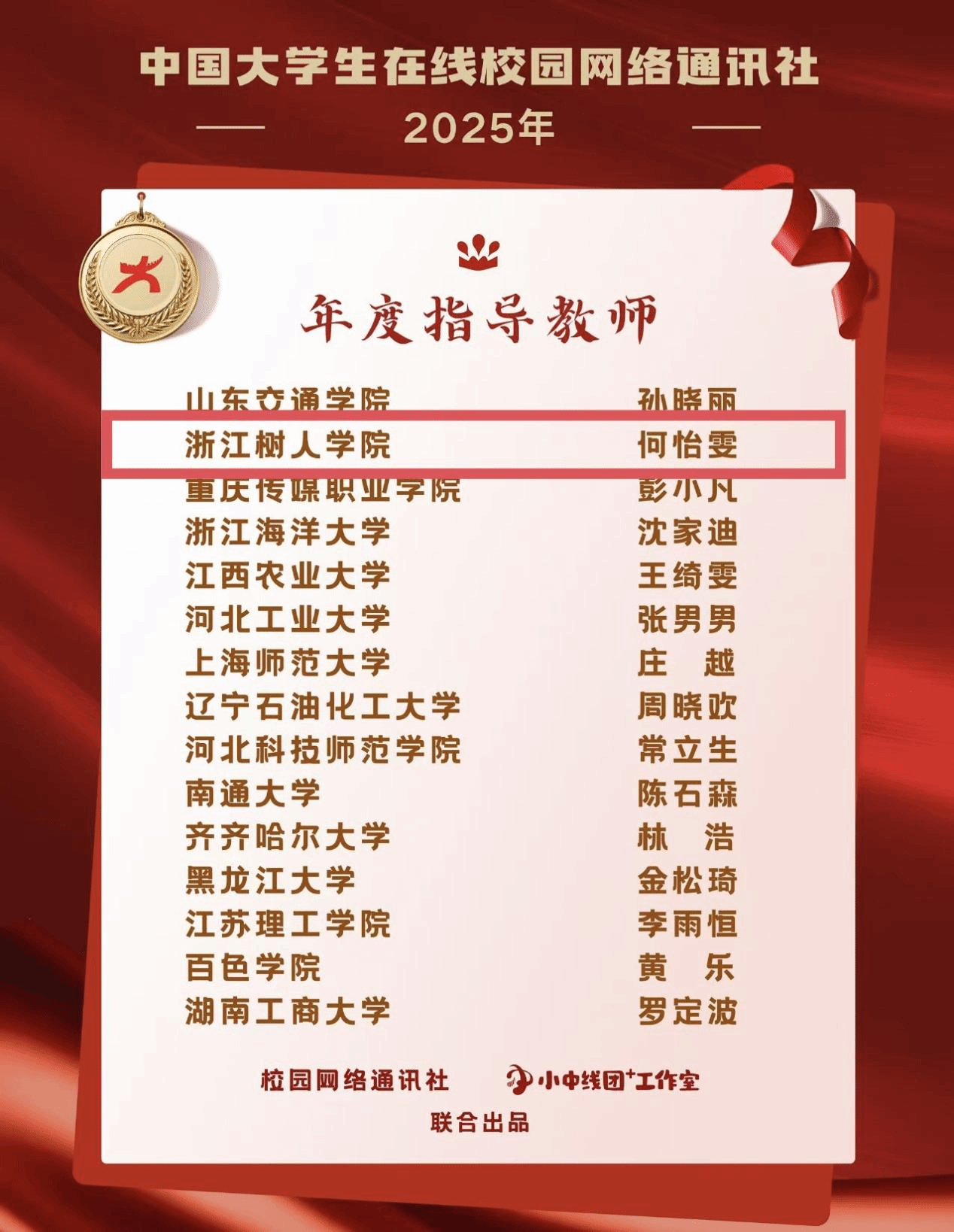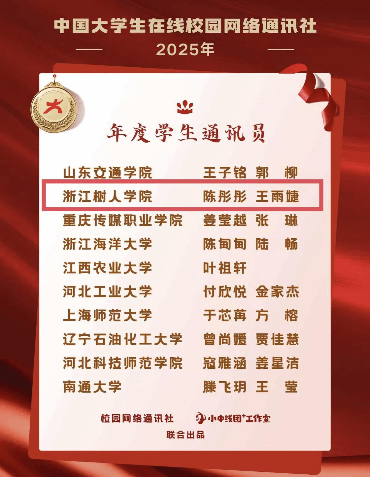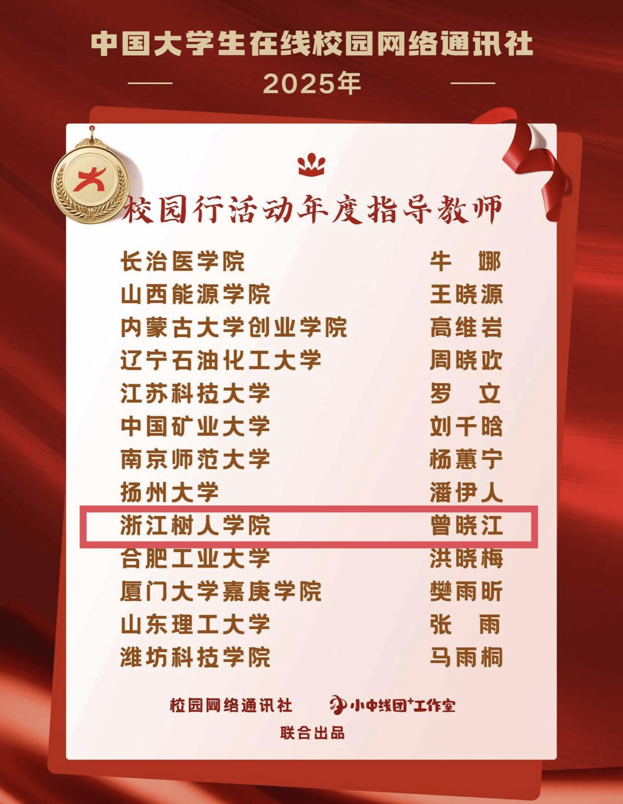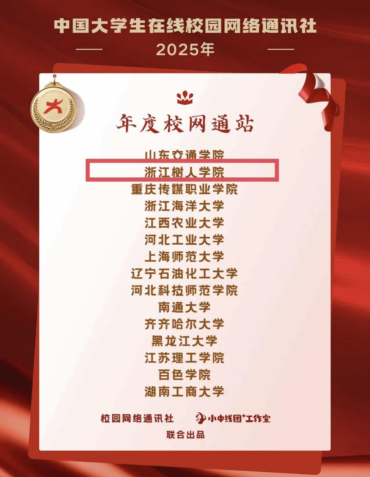 近日,教育部中国大学生在线公布了2025年度表彰名单。其中,浙江树人学院全媒体中心荣获“年度校网通站”“年度网络文化活动优秀组织高校”;学校党委宣传部副部长曾晓江老师获“校园行活动年度指导教师”;全媒体中心主任何怡雯老师获“‘中线团+’工作室年度指导老师”“年度指导老师”;全媒体中心学生陈彤彤、王雨婕获“年度学生通讯员”;姚梦琦获评“‘小中线团+’工作室高校网络文化内容运营达人”“‘小中线团+’工作室高校网络文化活动宣传达人”等9项荣誉。这是学校在2020年以来连续第5年获得中国大学生在线多项荣誉。