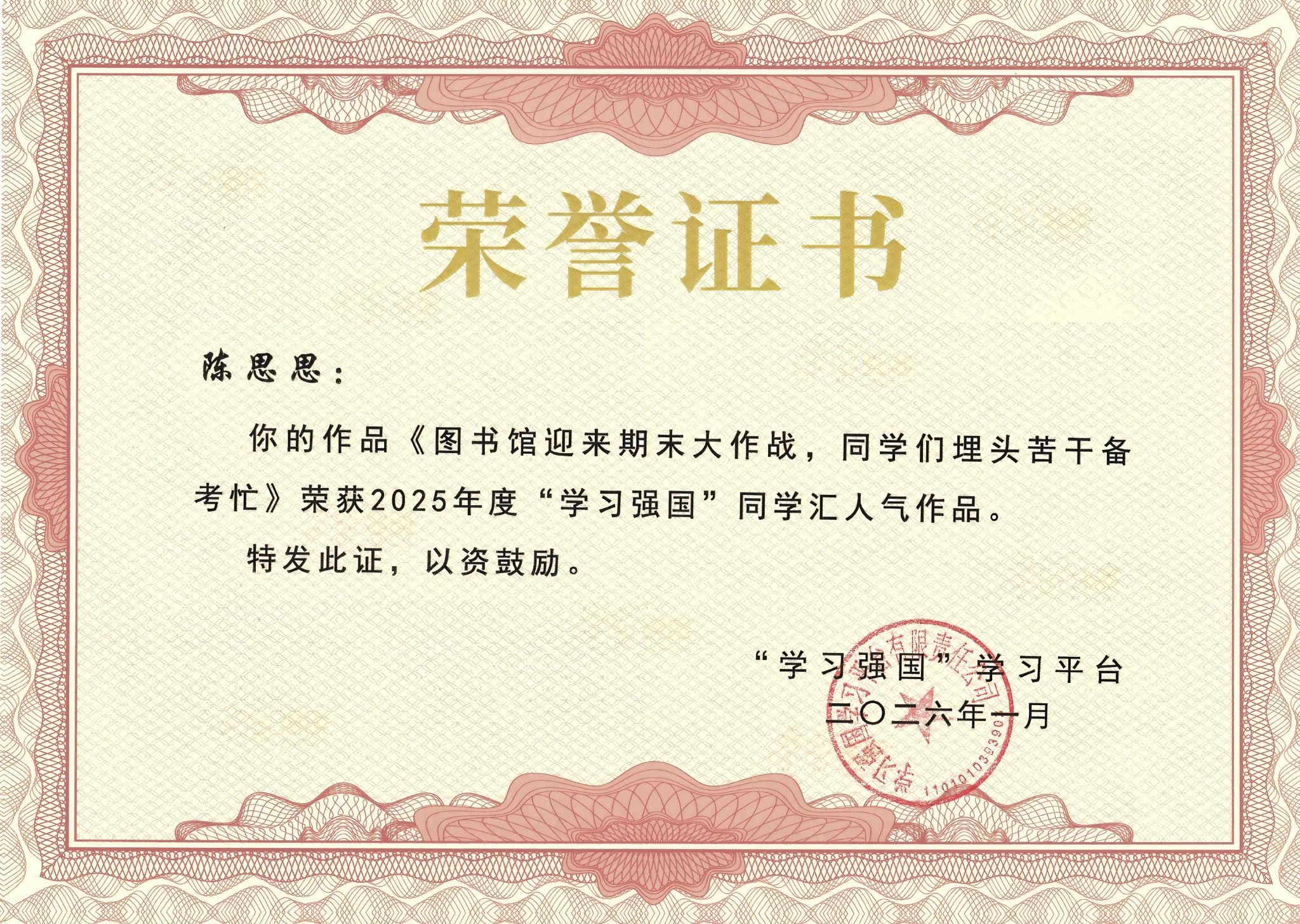 2025年,我校在“学习强国”同学汇各期榜单中表现突出:9次入围高校月度榜单,最高位列全国第8;9次入围高校人气作品榜,最高位列全国第3,作品被总平台点名称赞,播放量超10万;20次入围个人人气作品榜,最高位列全国第4。全年累计被学习强国总平台录用57个作品,平台年度阅读量超过230万,订阅量逾2000万。