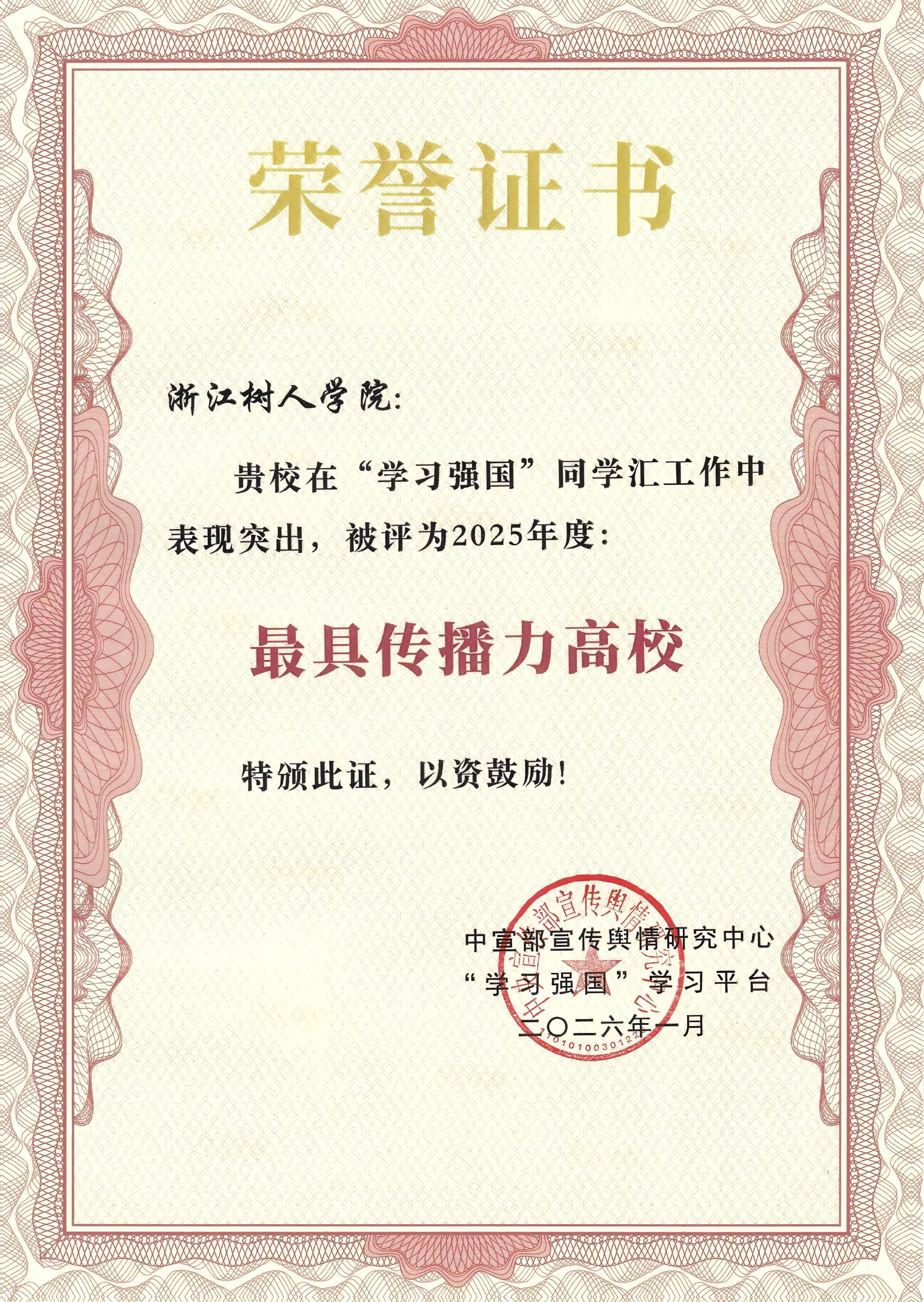 近日,“学习强国”同学汇2025年度榜单公布,我校被中宣部宣传舆情研究中心、“学习强国”学习平台授予“2025年度最具传播力高校”称号,校全媒体中心两位同学的作品入选“2025年度人气作品”。这是自2024年学校“同学汇”上线以来,学校连续两年获此殊荣,充分彰显了学校在思想引领与校园文化传播方面的扎实成效与广泛影响。