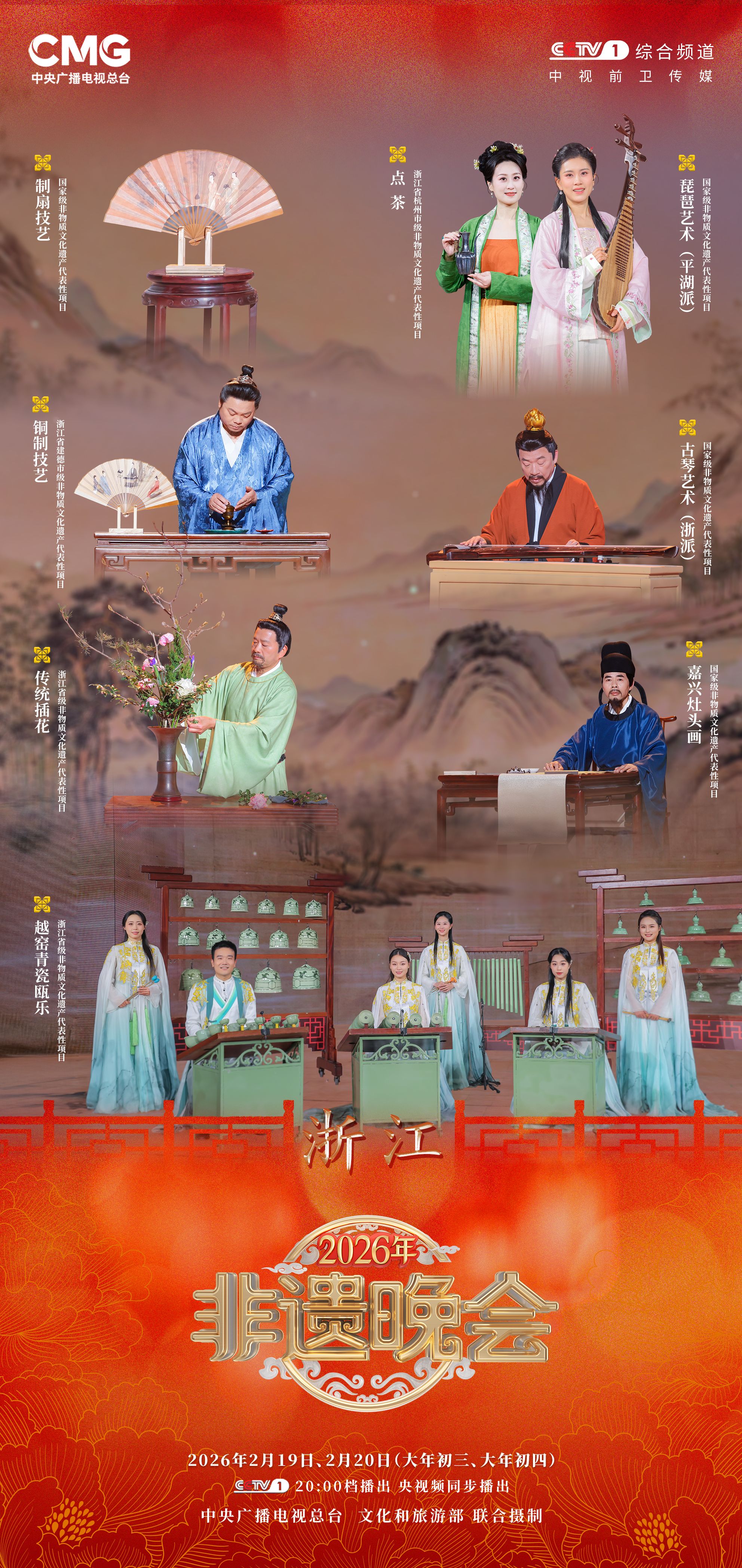 近日,由文化和旅游部与中央广播电视总台联合摄制的《非遗里的中国》新春特别节目——《2026年非遗晚会》,于CCTV-1央视综合频道播出。来自浙江的9个非遗项目精彩亮相,20余名非遗传承人及演职人员联袂献艺,向全国观众展现了浙江非遗的深厚底蕴与时代活力。