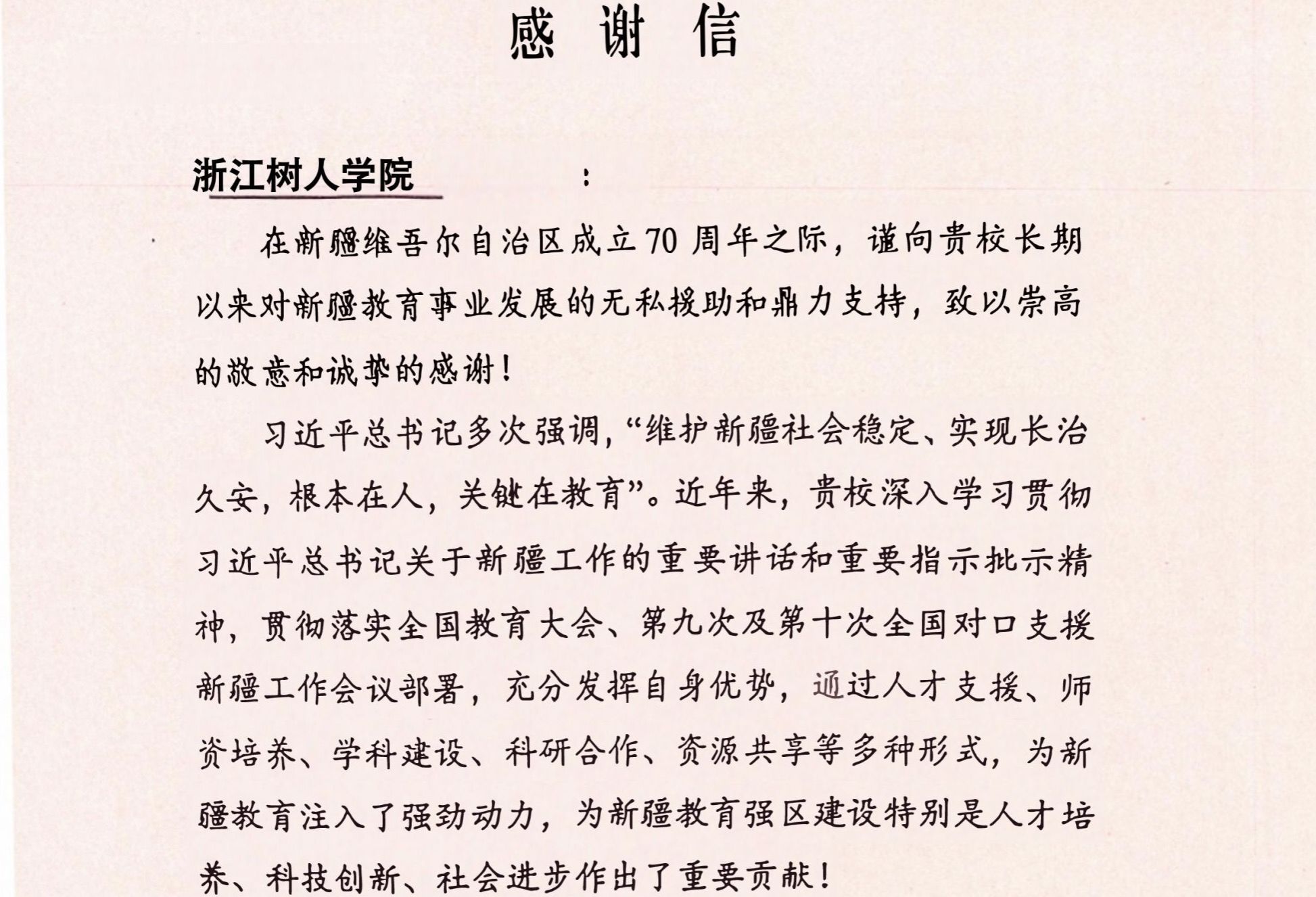 近日,浙江树人学院收到来自教育部民族教育司、新疆维吾尔自治区教育厅与新疆生产建设兵团教育局联名发出的感谢信,信中对我校长期以来在新疆教育事业发展中所作出的无私援助与鼎力支持表示衷心感谢,并致以崇高敬意。信中指出,在新疆维吾尔自治区成立70周年之际,我校积极落实全国教育大会及对口支援新疆工作会议部署,充分发挥自身教育优势,通过人才支援、师资培养、学科建设、科研合作、资源共享等多种方式,为新疆教育事业注入了强劲动力,...